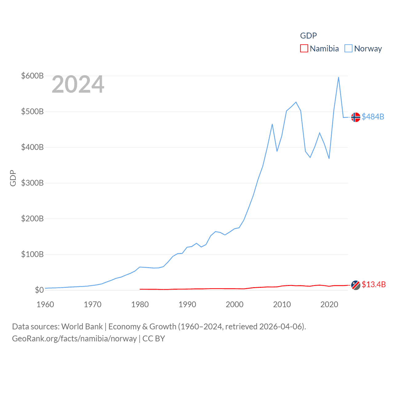 By GDP, Namibia ranks 147/197 ($13.4B) and Norway ranks 32/197 ($484B). By GDP per capita, Namibia ranks 126/197 ($4,413), while Norway ranks 8/197 ($86,785).