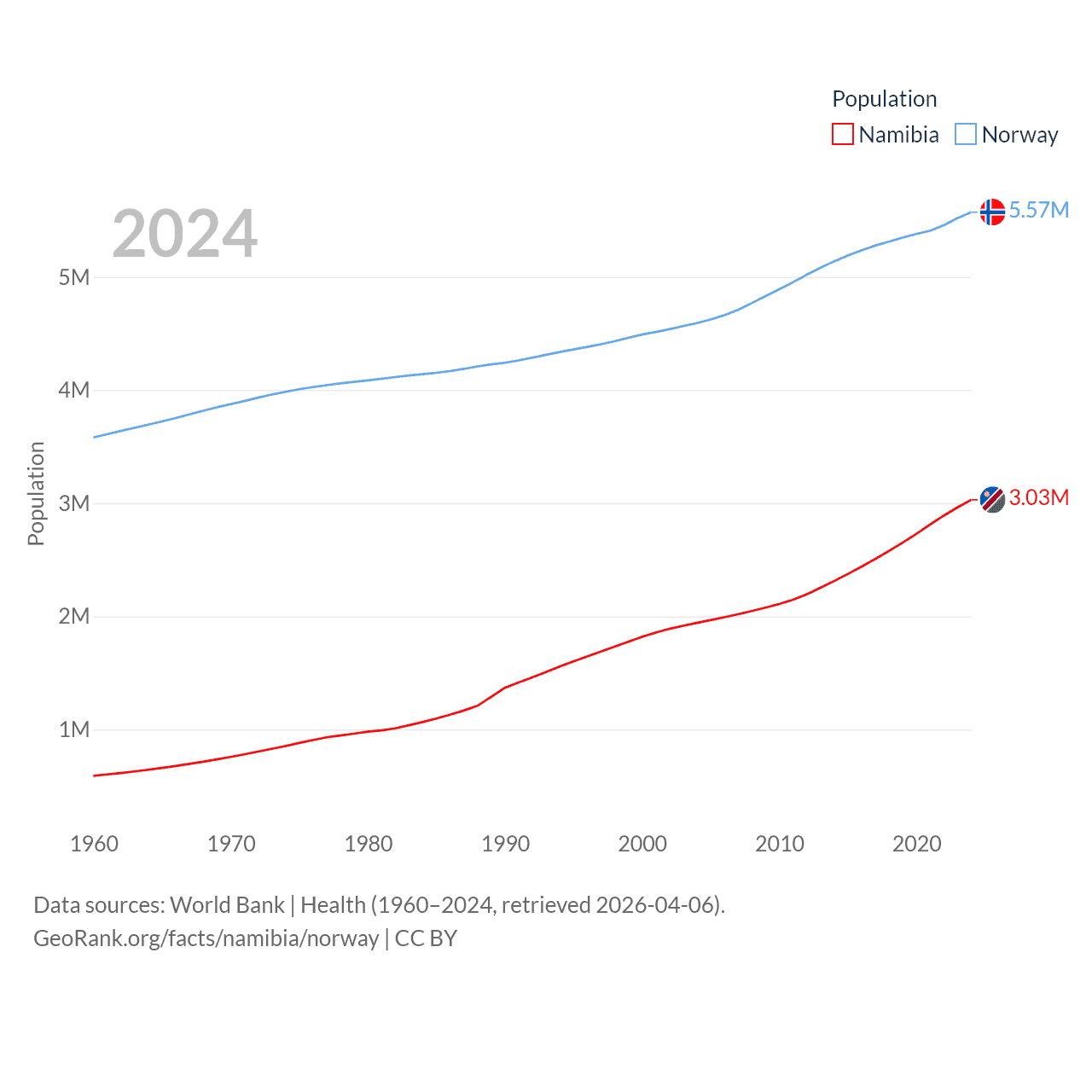 Namibia has a population of 3.03M (ranked 136/197), compared with 5.57M in Norway (ranked 118/197). Namibia's land area is 317,874 sq mi versus 140,645 sq mi for Norway (ranked 33rd vs. 62nd).
