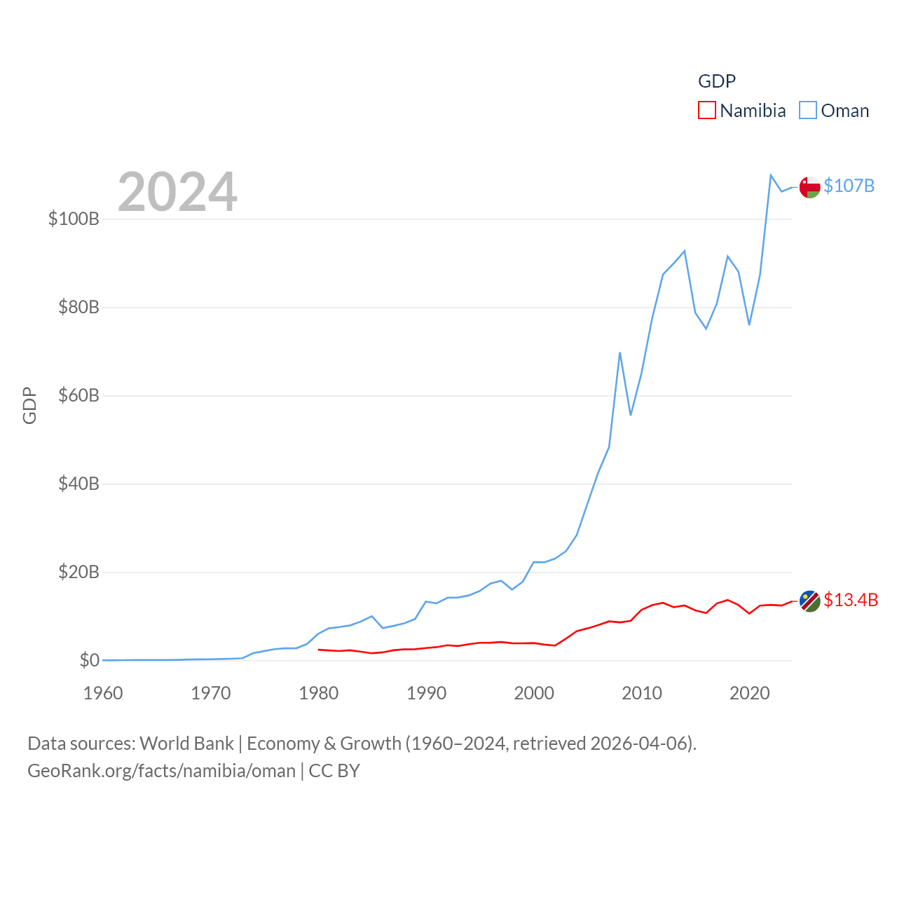 By GDP, Namibia ranks 147/197 ($13.4B) and Oman ranks 70/197 ($107B). By GDP per capita, Namibia ranks 126/197 ($4,413), while Oman ranks 57/197 ($20,285).