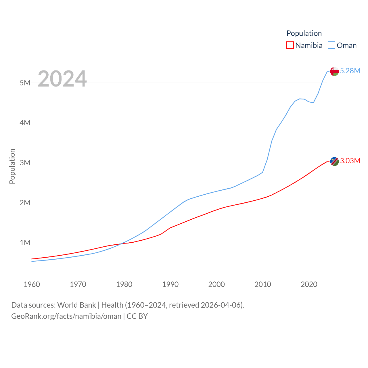Namibia has a population of 3.03M (ranked 136/197), compared with 5.28M in Oman (ranked 124/197). Namibia's land area is 317,874 sq mi versus 119,499 sq mi for Oman (ranked 33rd vs. 68th).