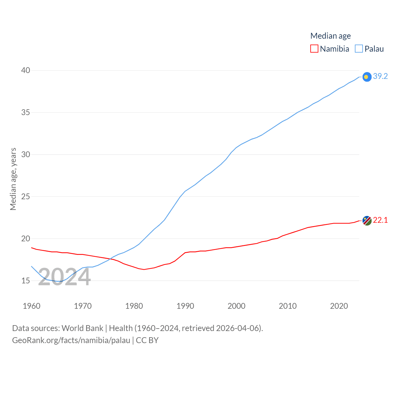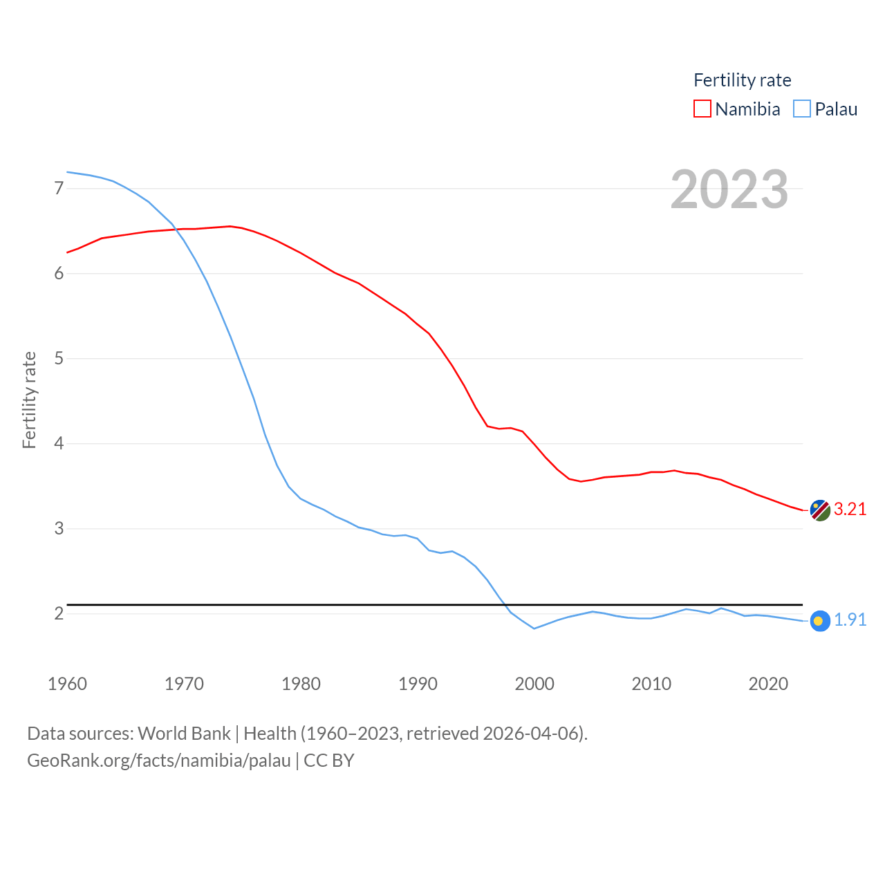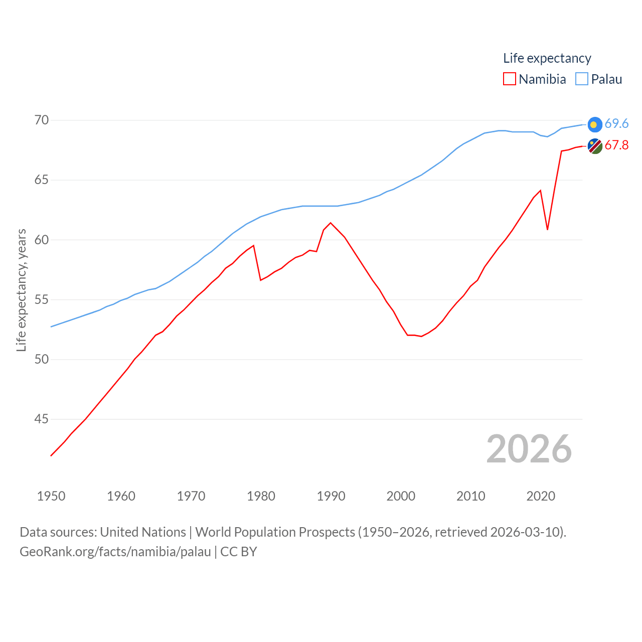 Namibia has a population of 3.03M (ranked 136/197), compared with 17.7K in Palau (ranked 194/197). Namibia's land area is 317,874 sq mi versus 177.6 sq mi for Palau (ranked 33rd vs. 180th).
