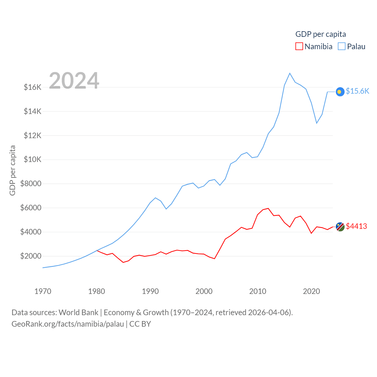 By GDP, Namibia ranks 147/197 ($13.4B) and Palau ranks 194/197 ($277M). By GDP per capita, Namibia ranks 126/197 ($4,413), while Palau ranks 67/197 ($15,611).