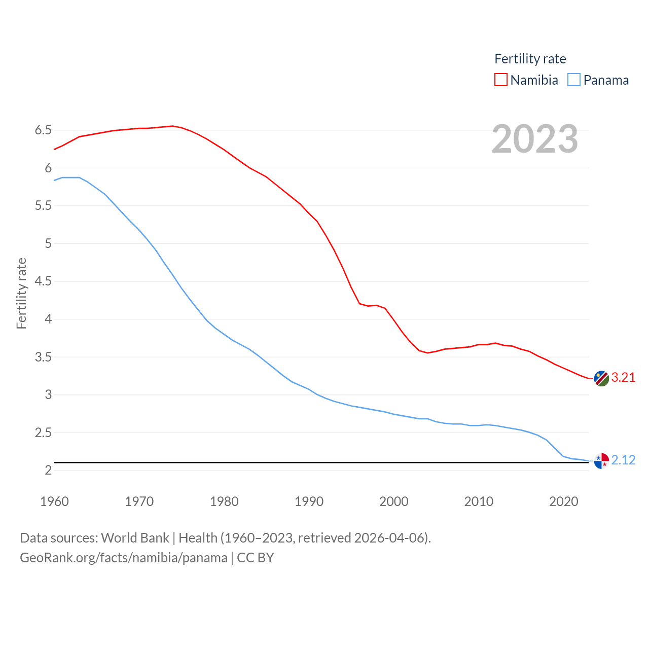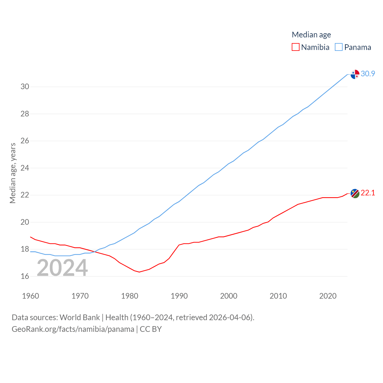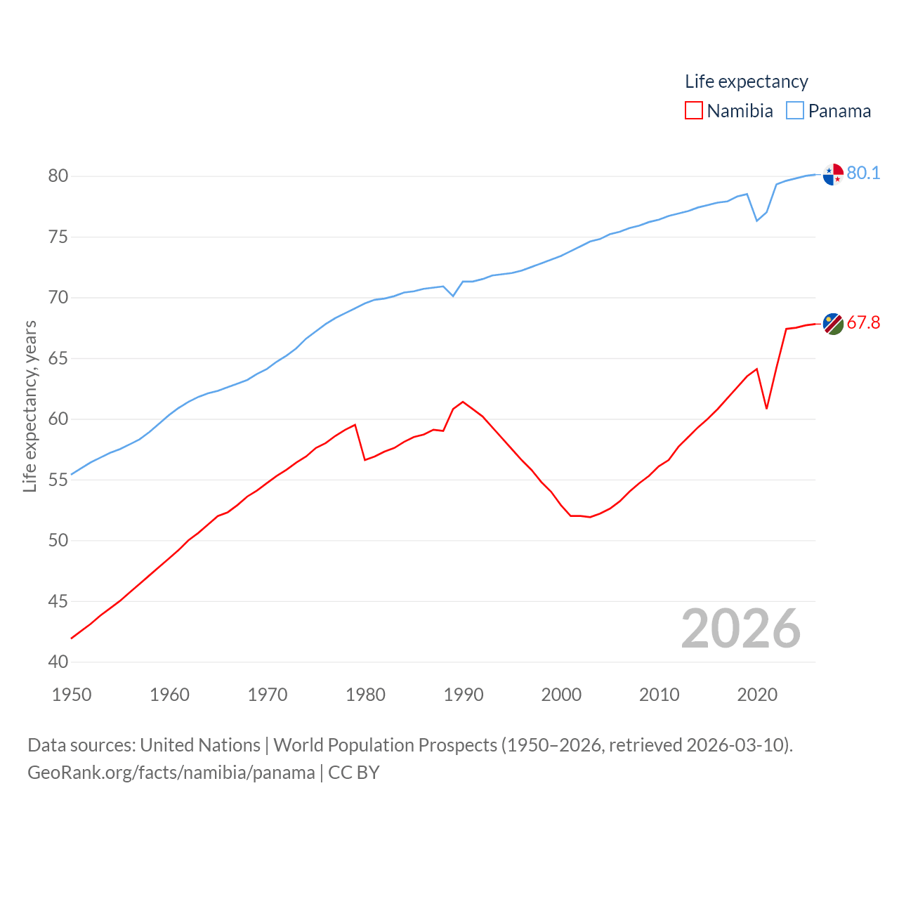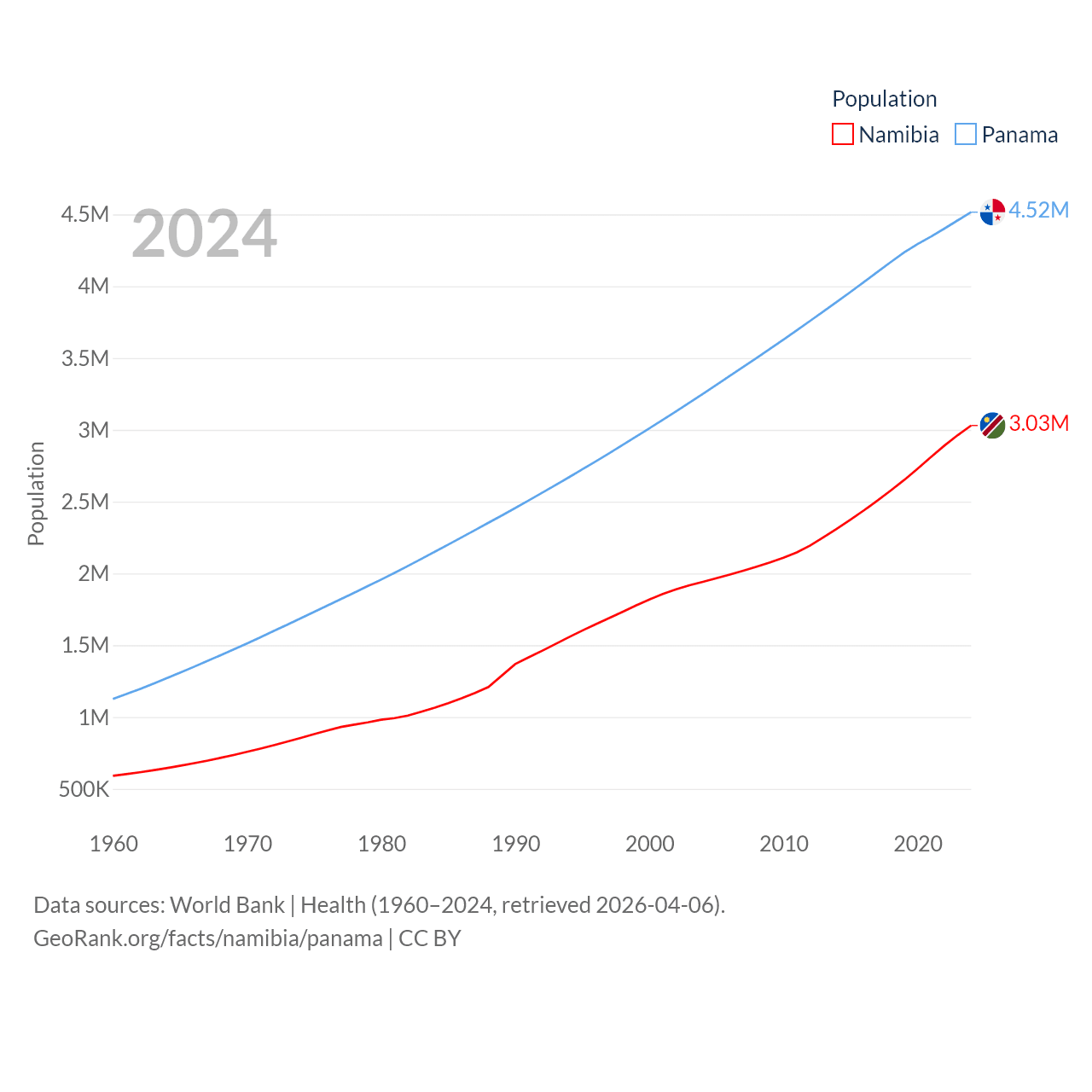 Namibia has a population of 3.03M (ranked 136/197), compared with 4.52M in Panama (ranked 128/197). Namibia's land area is 317,874 sq mi versus 28,641 sq mi for Panama (ranked 33rd vs. 115th).