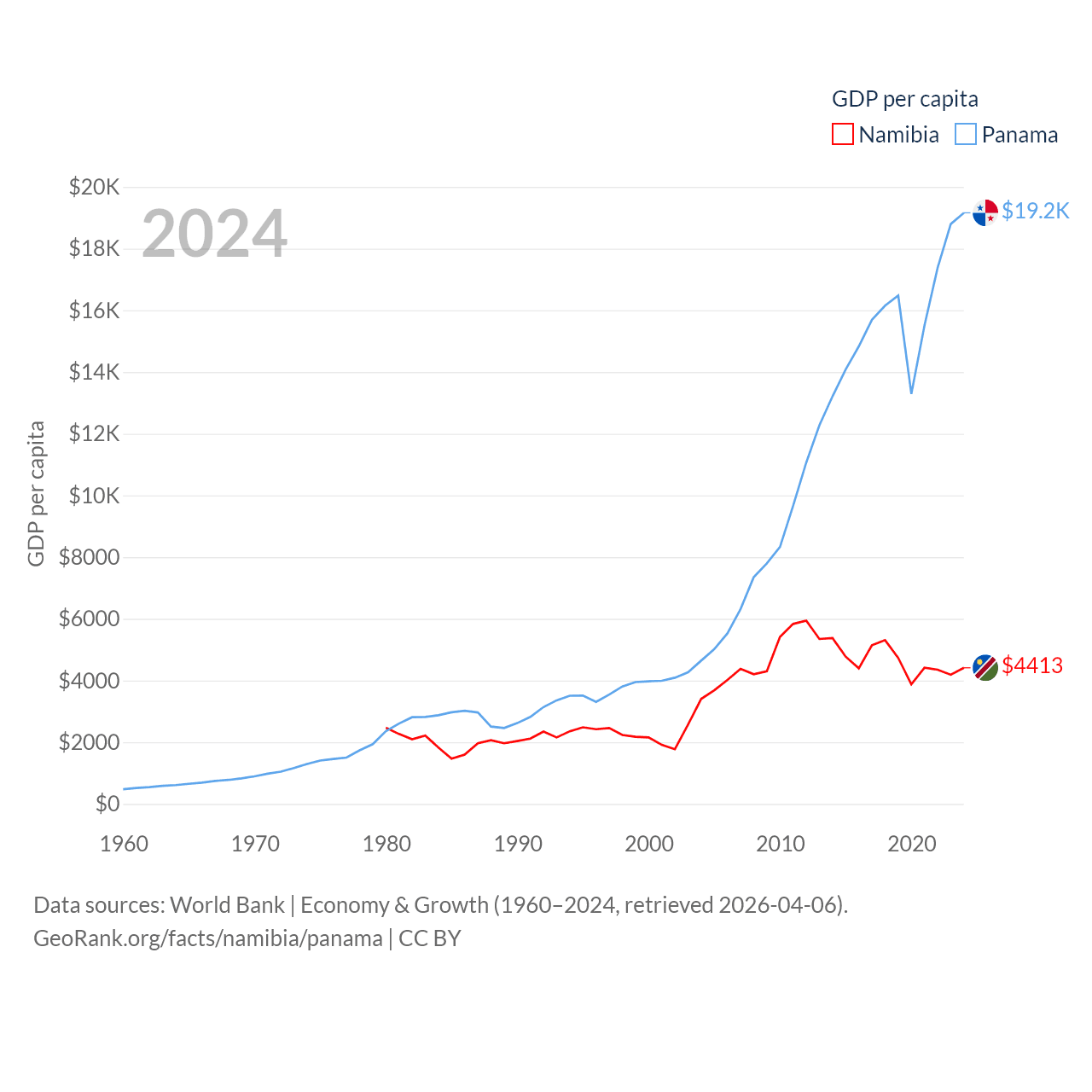 By GDP, Namibia ranks 147/197 ($13.4B) and Panama ranks 78/197 ($86.5B). By GDP per capita, Namibia ranks 126/197 ($4,413), while Panama ranks 60/197 ($19,161).