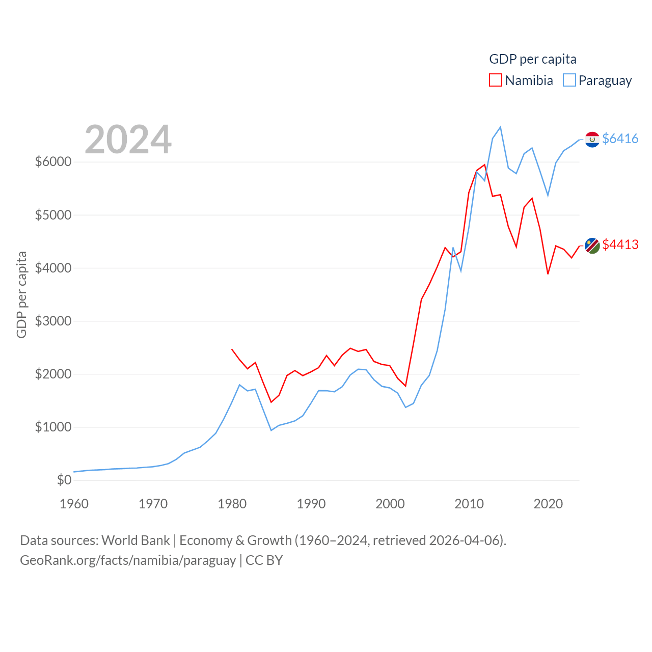 By GDP, Namibia ranks 147/197 ($13.4B) and Paraguay ranks 98/197 ($44.5B). By GDP per capita, Namibia ranks 126/197 ($4,413), while Paraguay ranks 109/197 ($6,416).