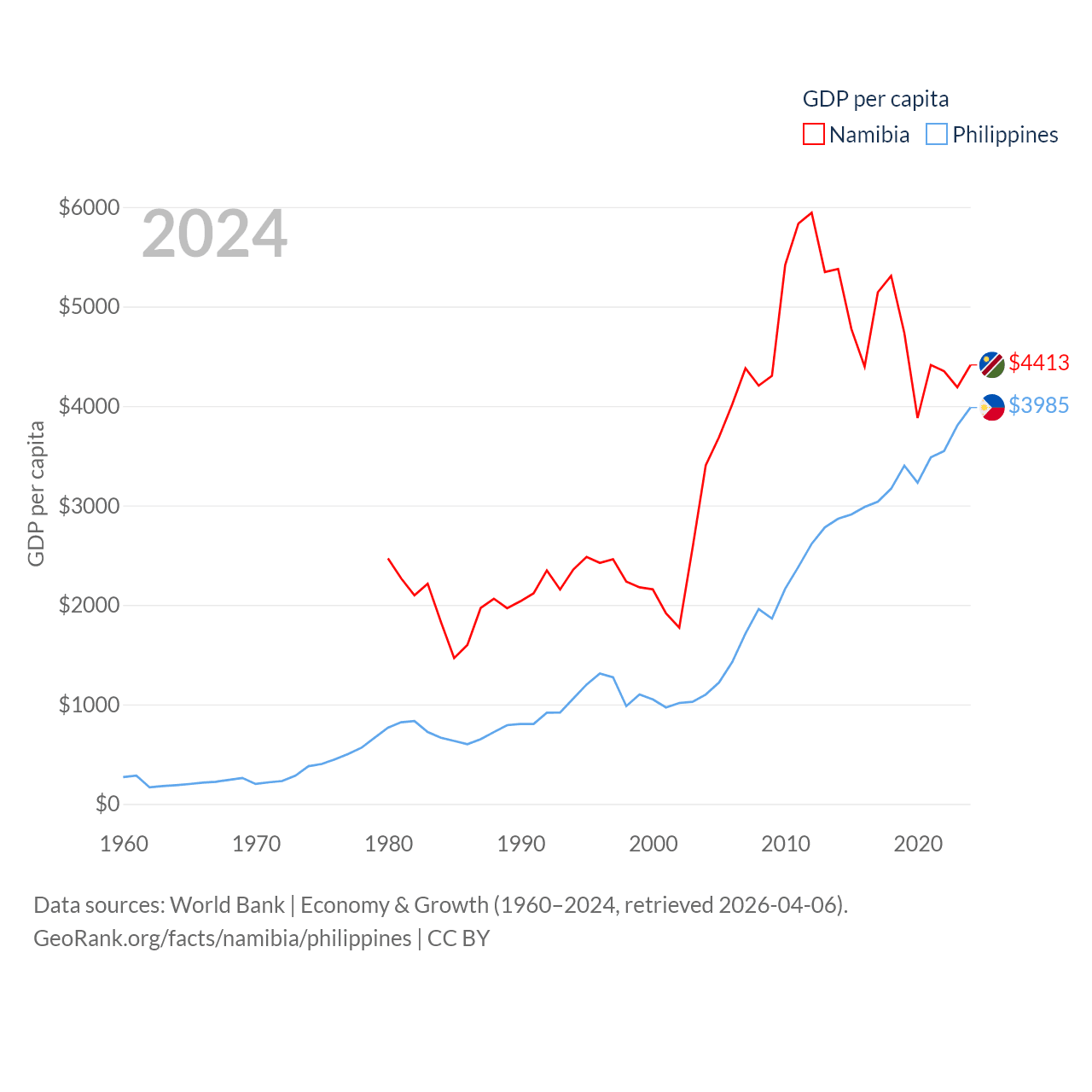 By GDP, Namibia ranks 147/197 ($13.4B) and The Philippines ranks 35/197 ($462B). By GDP per capita, Namibia ranks 126/197 ($4,413), while The Philippines ranks 130/197 ($3,985).