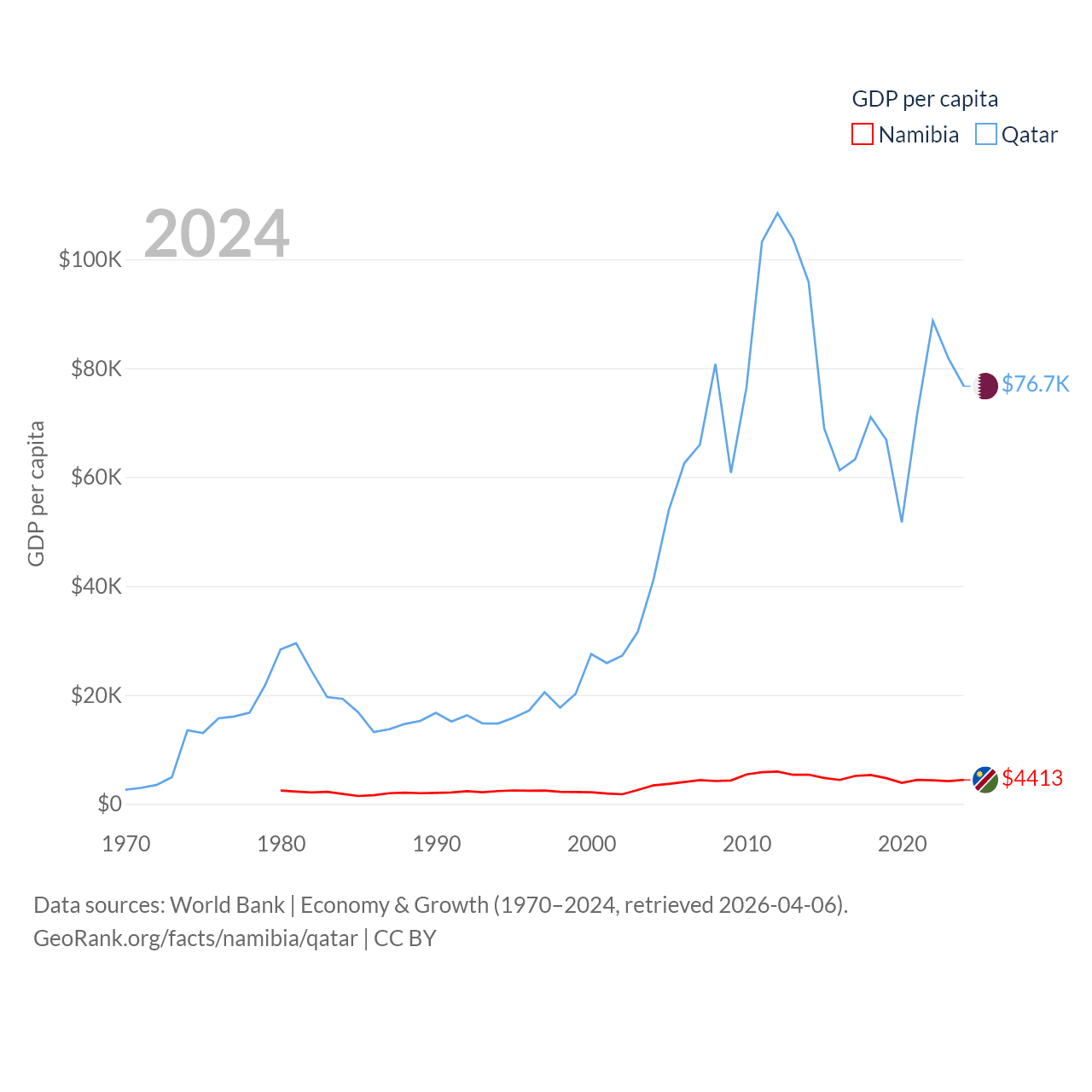 By GDP, Namibia ranks 147/197 ($13.4B) and Qatar ranks 56/197 ($219B). By GDP per capita, Namibia ranks 126/197 ($4,413), while Qatar ranks 11/197 ($76,689).