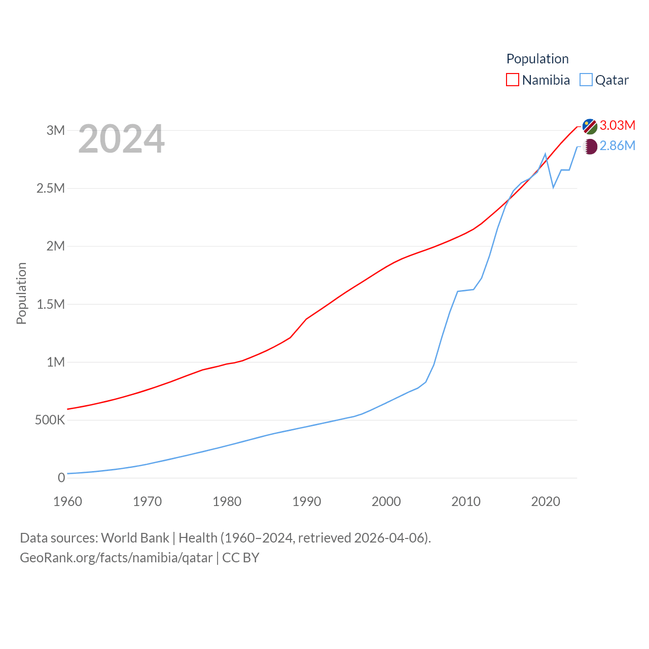 Namibia has a population of 3.03M (ranked 136/197), compared with 2.86M in Qatar (ranked 138/197). Namibia's land area is 317,874 sq mi versus 4,436 sq mi for Qatar (ranked 33rd vs. 158th).