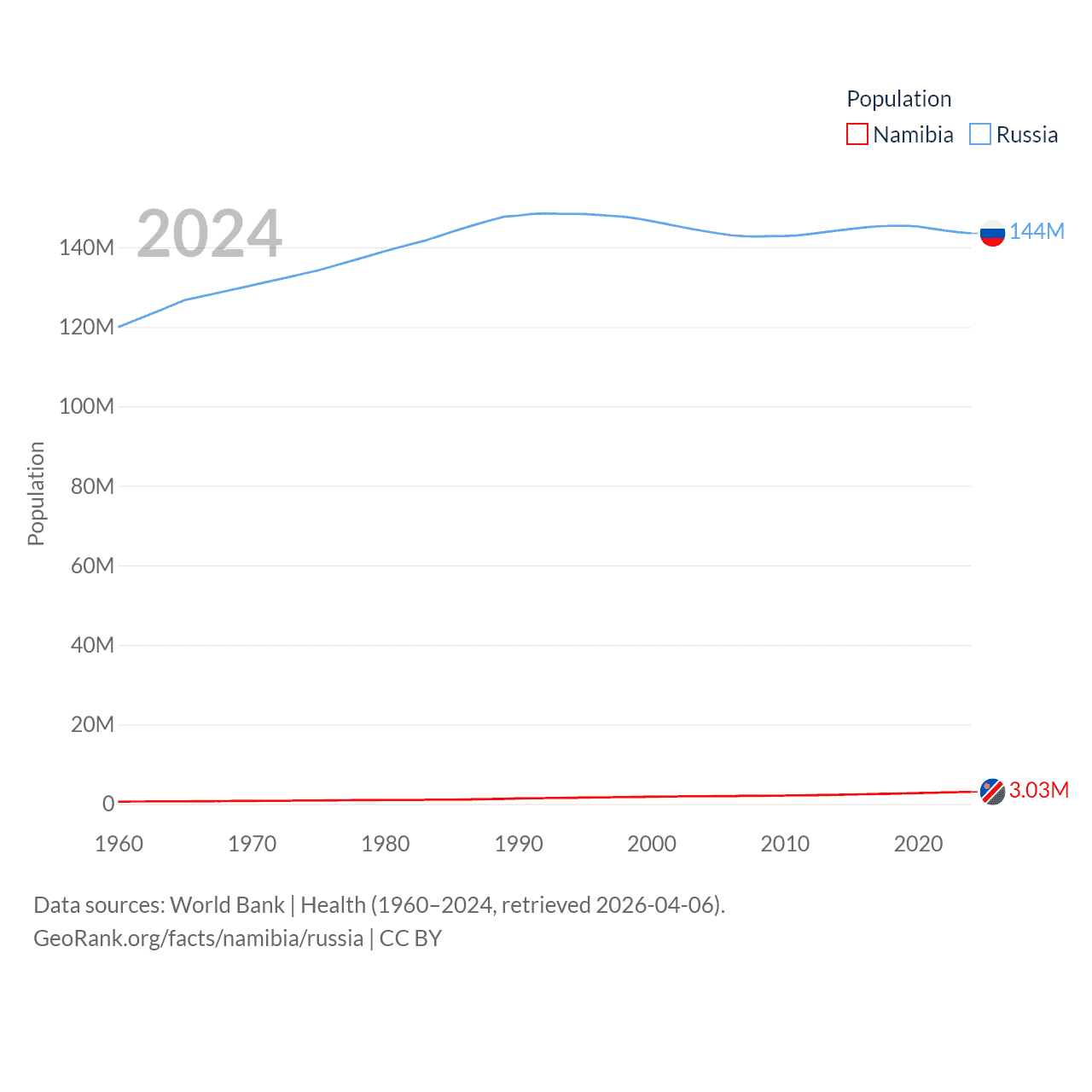 Namibia has a population of 3.03M (ranked 136/197), compared with 144M in Russia (ranked 9/197). Namibia's land area is 317,874 sq mi versus 6,323,145 sq mi for Russia (ranked 33rd vs. 1st).