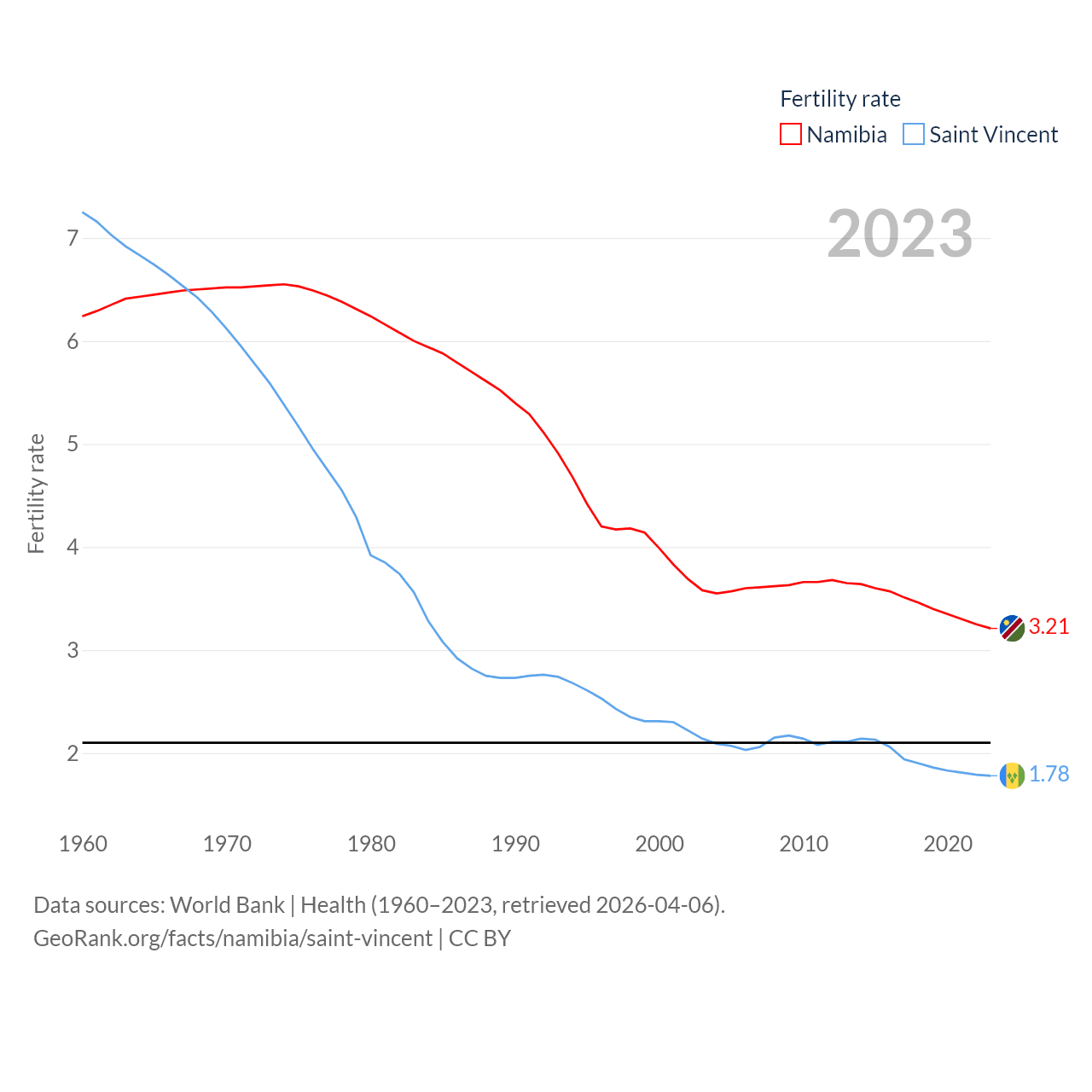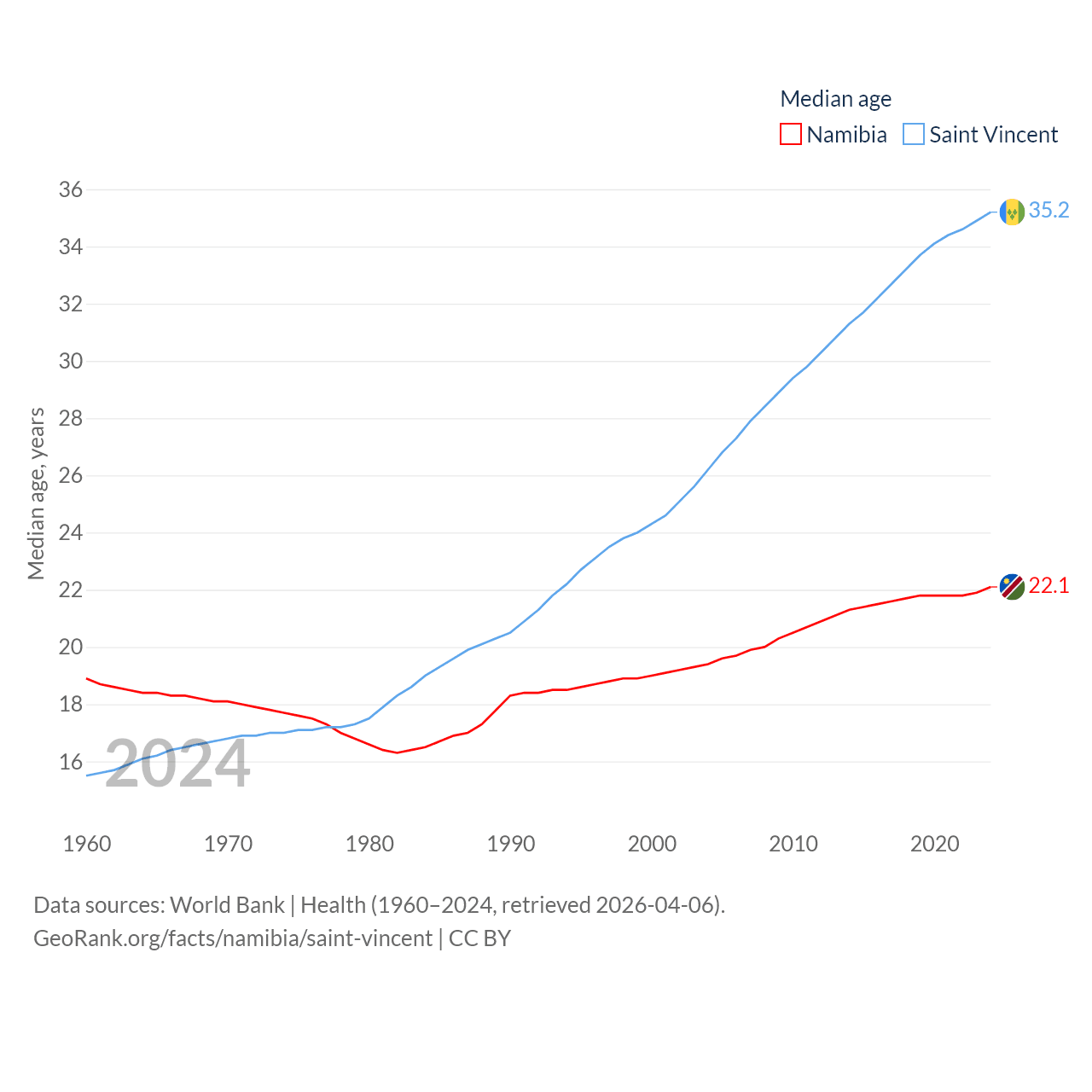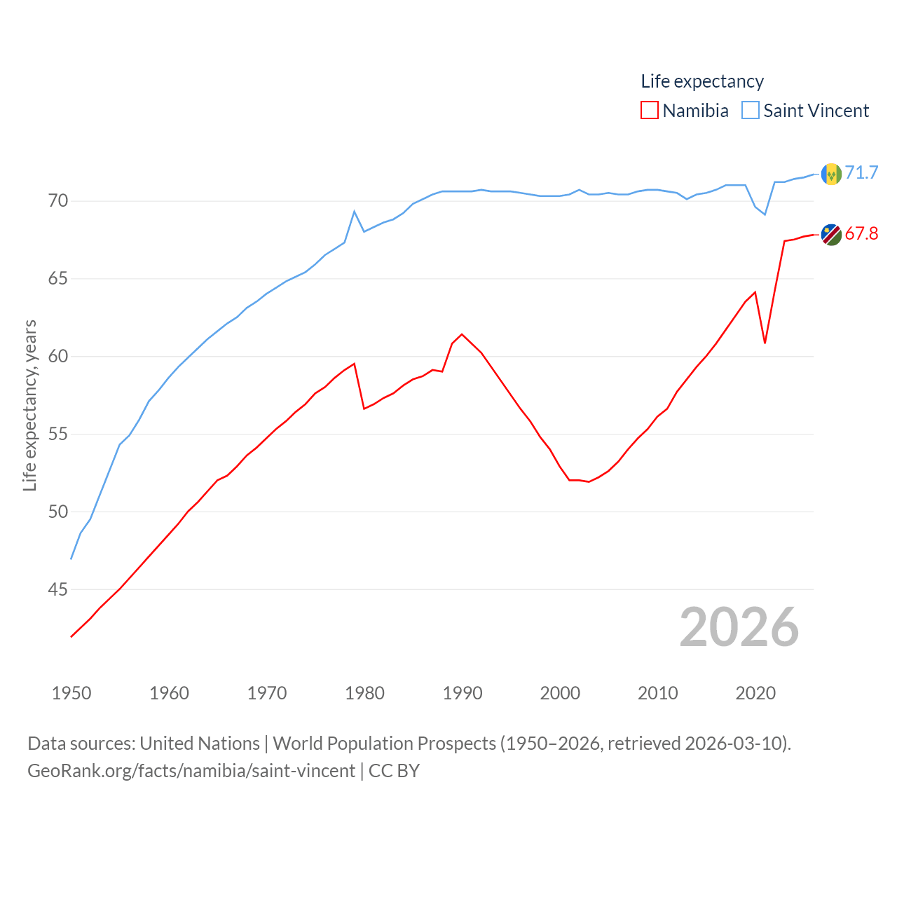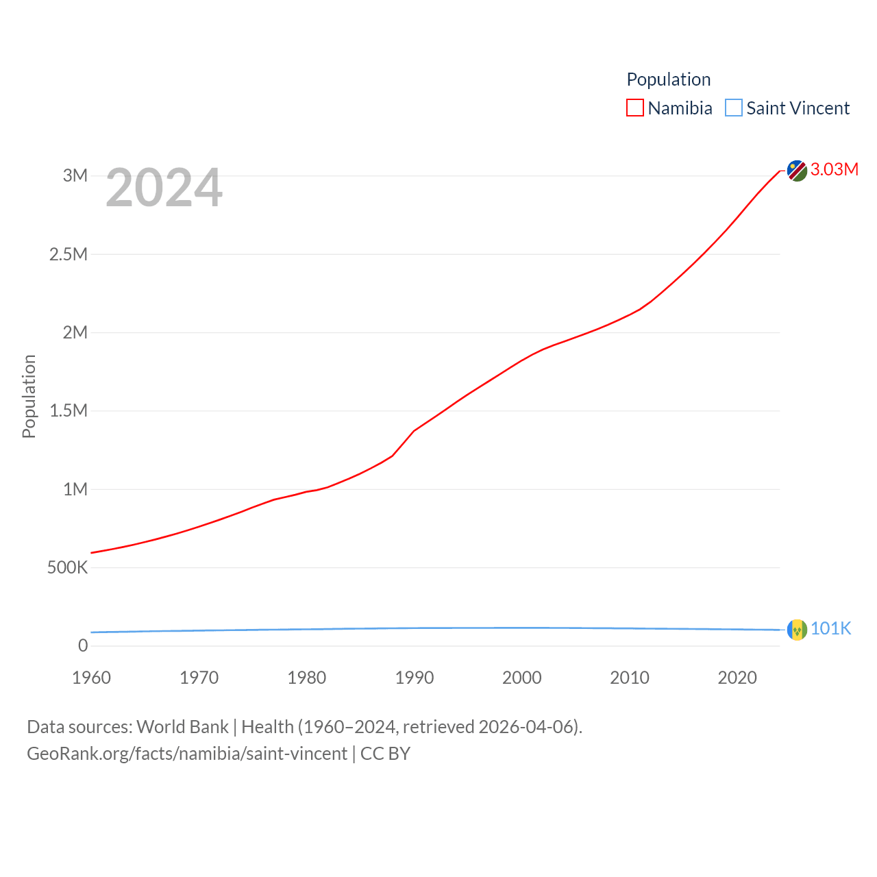 Namibia has a population of 3.03M (ranked 136/197), compared with 101K in Saint Vincent (ranked 184/197). Namibia's land area is 317,874 sq mi versus 150.6 sq mi for Saint Vincent (ranked 33rd vs. 185th).