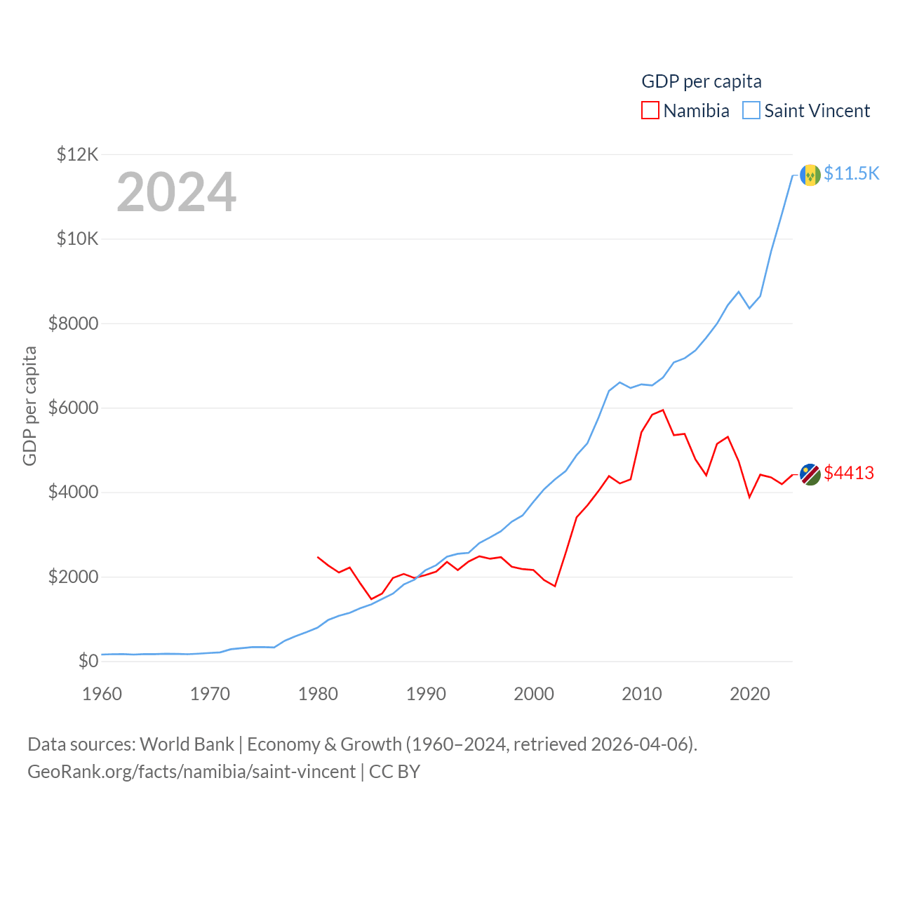 By GDP, Namibia ranks 147/197 ($13.4B) and Saint Vincent ranks 186/197 ($1.16B). By GDP per capita, Namibia ranks 126/197 ($4,413), while Saint Vincent ranks 81/197 ($11,501).