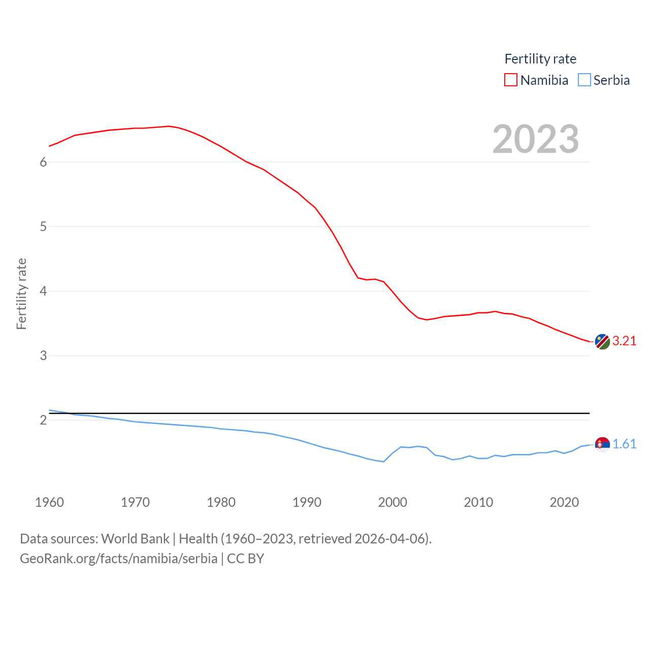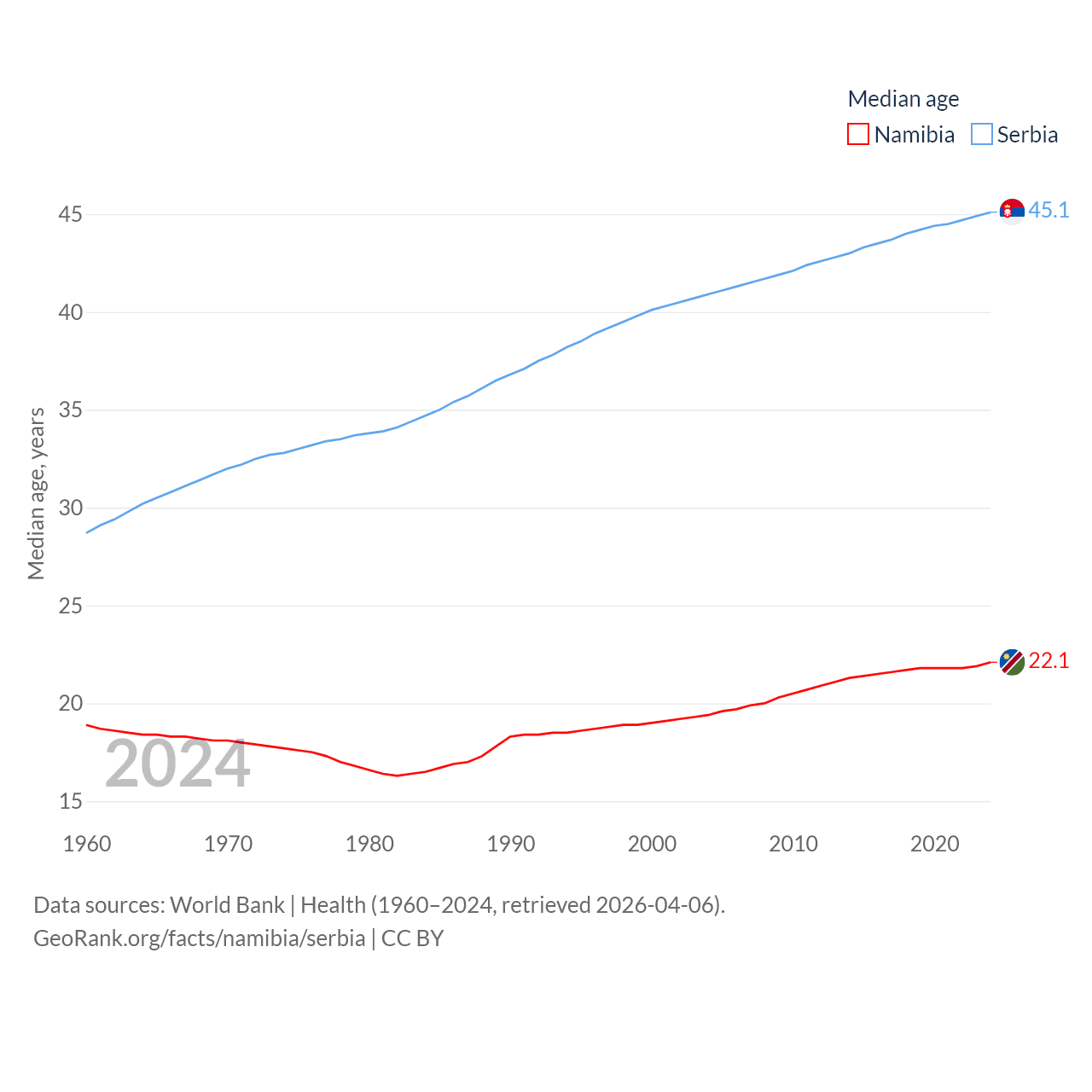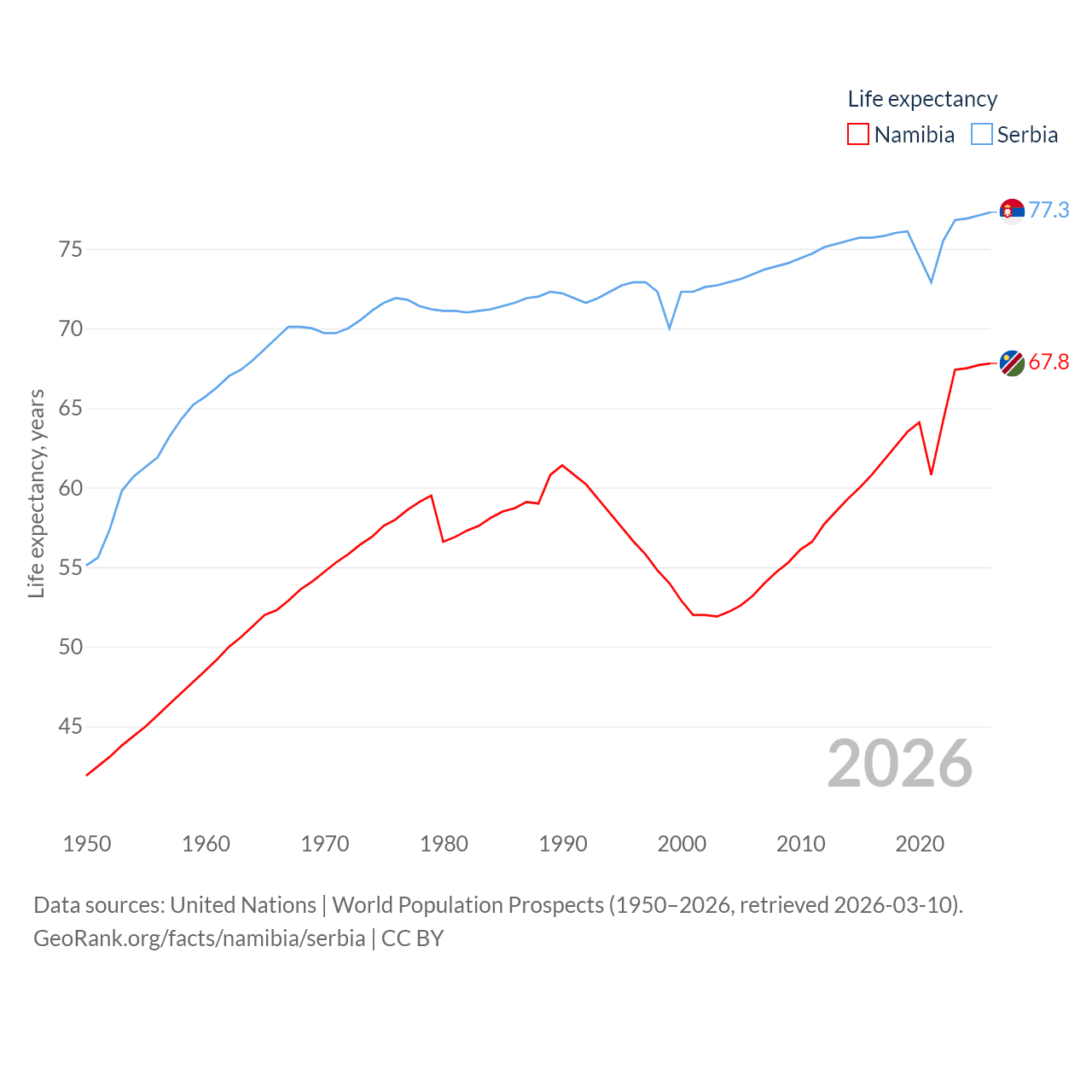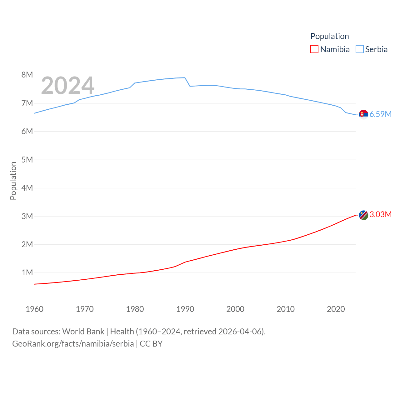 Namibia has a population of 3.03M (ranked 136/197), compared with 6.59M in Serbia (ranked 109/197). Namibia's land area is 317,874 sq mi versus 32,467 sq mi for Serbia (ranked 33rd vs. 111th).