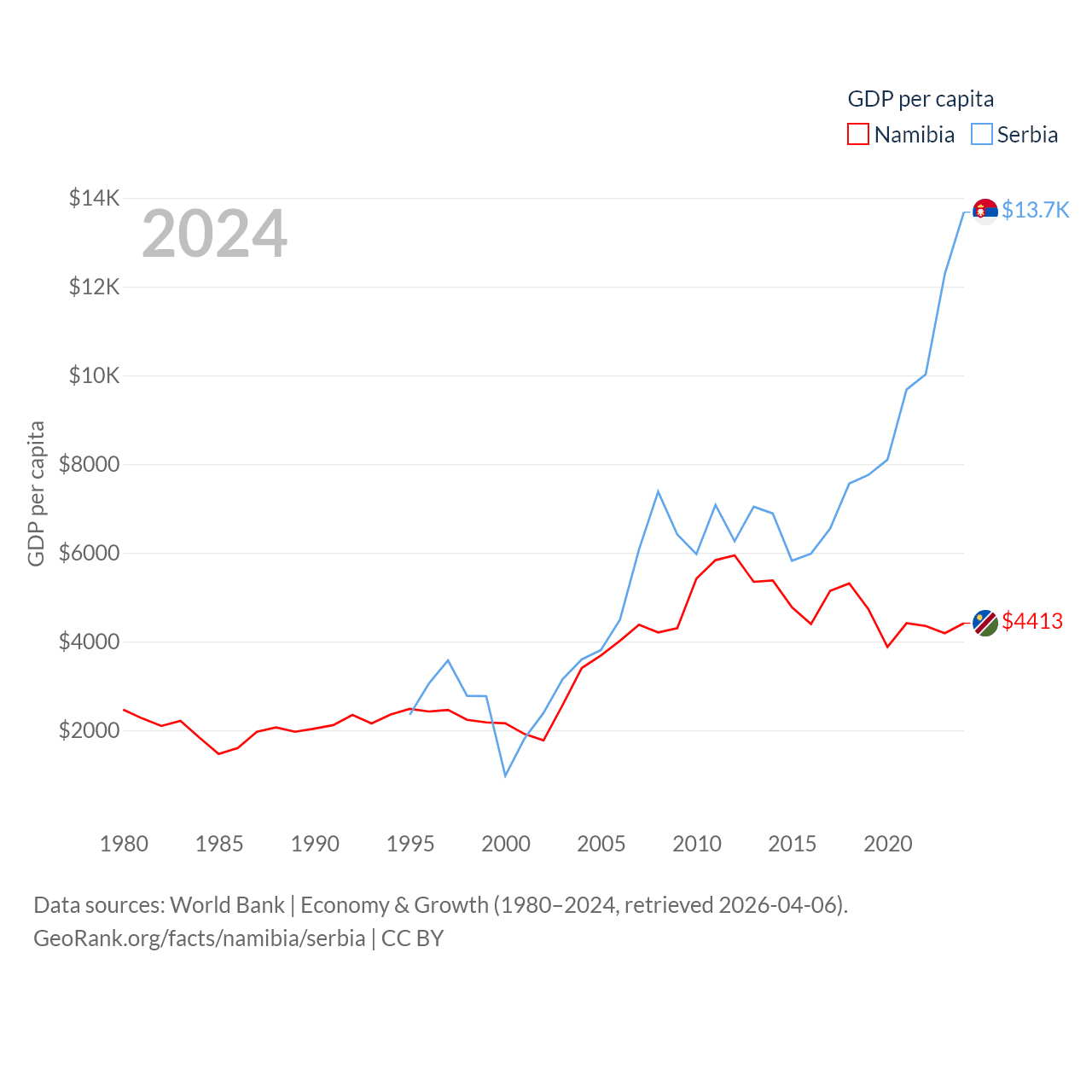 By GDP, Namibia ranks 147/197 ($13.4B) and Serbia ranks 76/197 ($90.1B). By GDP per capita, Namibia ranks 126/197 ($4,413), while Serbia ranks 73/197 ($13,679).