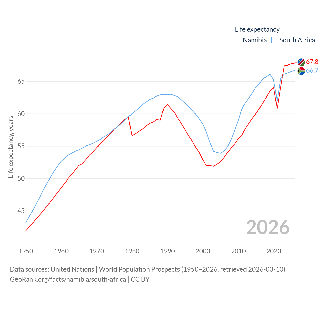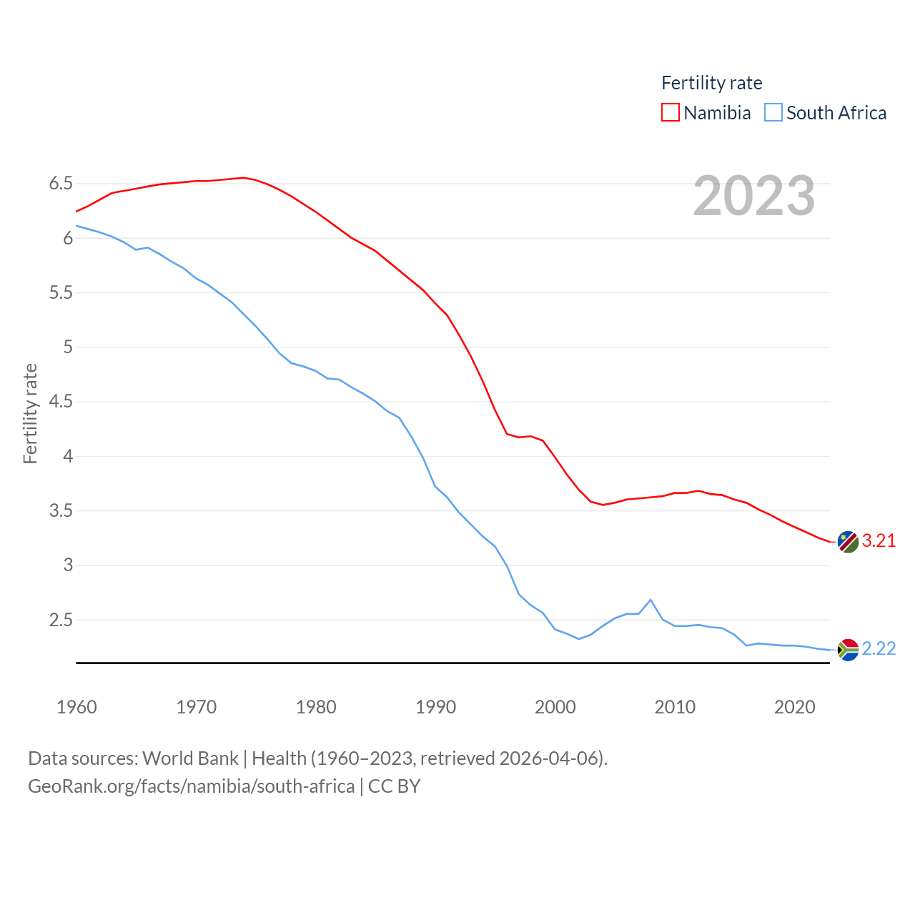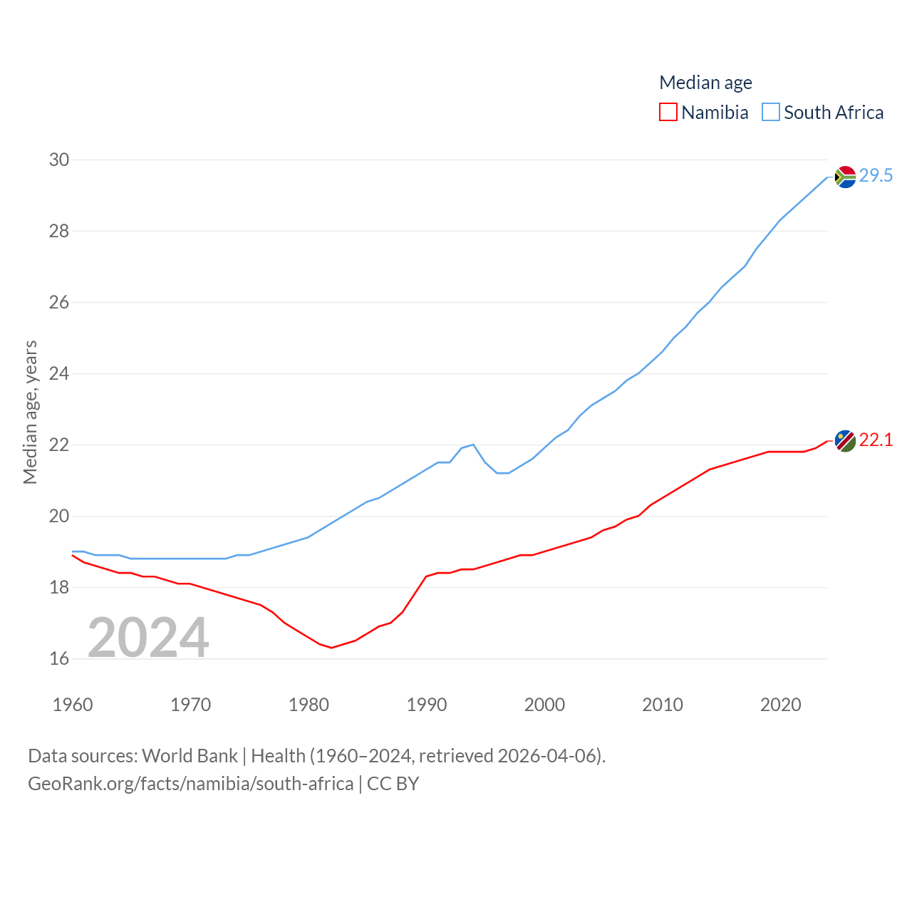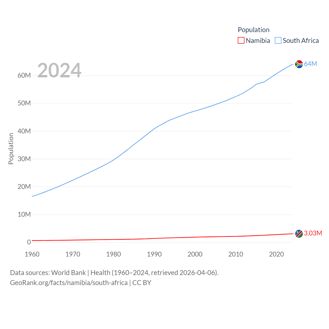 Namibia has a population of 3.03M (ranked 136/197), compared with 64M in South Africa (ranked 24/197). Namibia's land area is 317,874 sq mi versus 468,377 sq mi for South Africa (ranked 33rd vs. 24th).