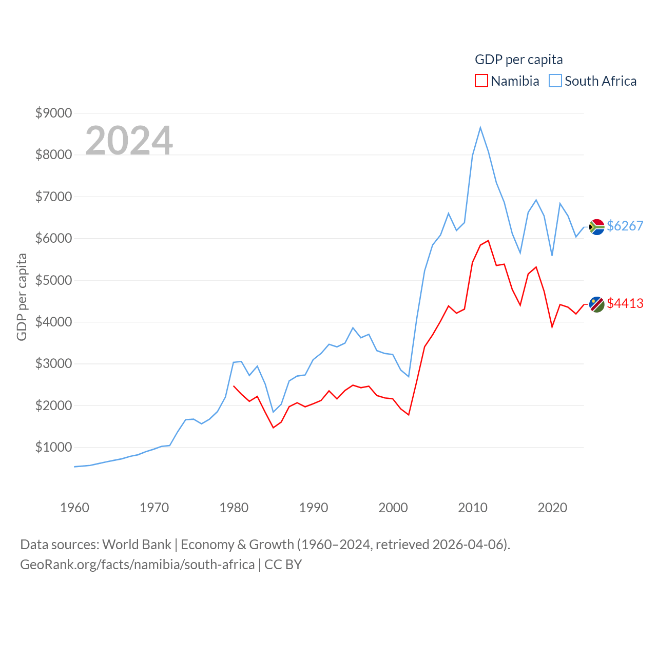 By GDP, Namibia ranks 147/197 ($13.4B) and South Africa ranks 40/197 ($401B). By GDP per capita, Namibia ranks 126/197 ($4,413), while South Africa ranks 111/197 ($6,267).