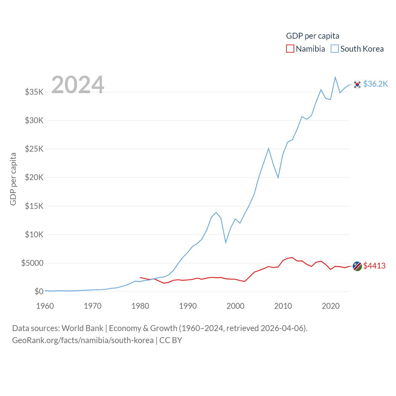 By GDP, Namibia ranks 147/197 ($13.4B) and South Korea ranks 12/197 ($1.88T). By GDP per capita, Namibia ranks 126/197 ($4,413), while South Korea ranks 31/197 ($36,239).