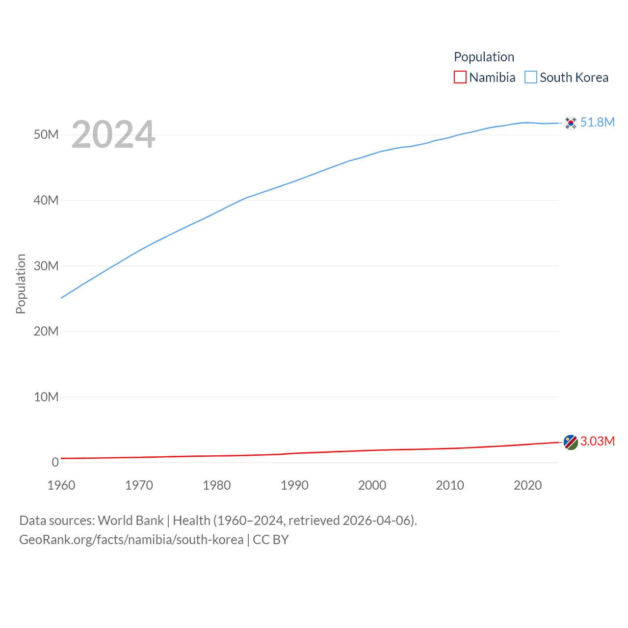 Namibia has a population of 3.03M (ranked 136/197), compared with 51.8M in South Korea (ranked 29/197). Namibia's land area is 317,874 sq mi versus 37,684 sq mi for South Korea (ranked 33rd vs. 105th).