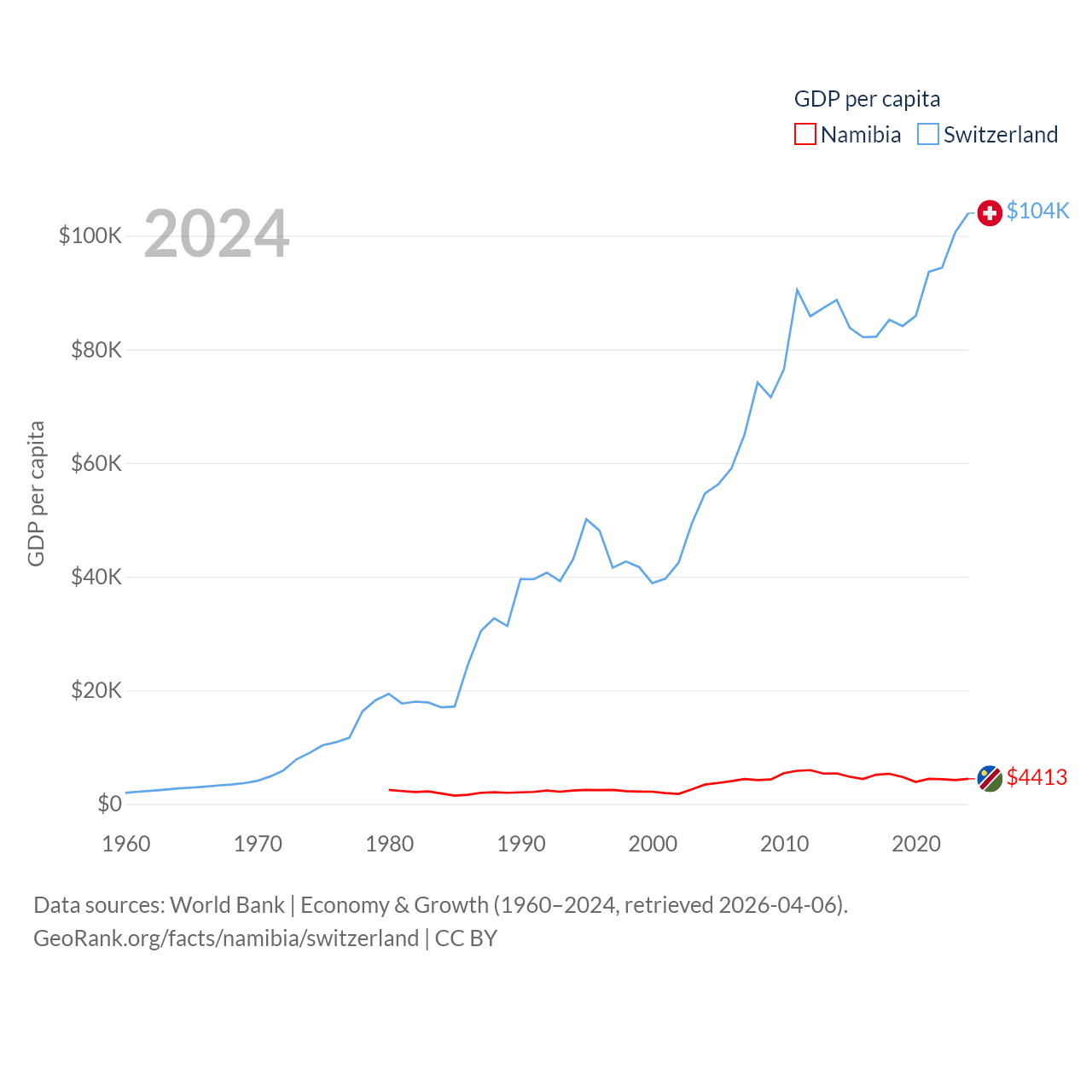 By GDP, Namibia ranks 147/197 ($13.4B) and Switzerland ranks 20/197 ($937B). By GDP per capita, Namibia ranks 126/197 ($4,413), while Switzerland ranks 5/197 ($103,998).