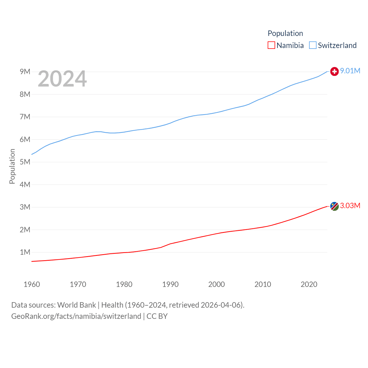 Namibia has a population of 3.03M (ranked 136/197), compared with 9.01M in Switzerland (ranked 101/197). Namibia's land area is 317,874 sq mi versus 15,255 sq mi for Switzerland (ranked 33rd vs. 131st).