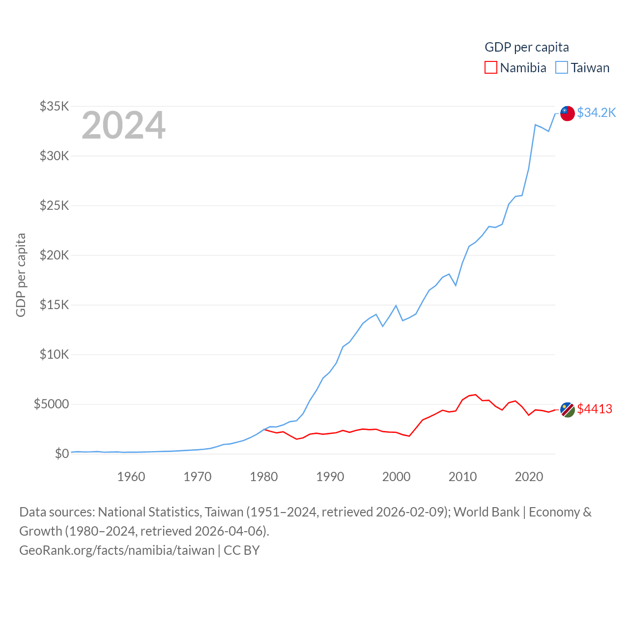 By GDP, Namibia ranks 147/197 ($13.4B) and Taiwan ranks 22/197 ($802B). By GDP per capita, Namibia ranks 126/197 ($4,413), while Taiwan ranks 35/197 ($34,238).