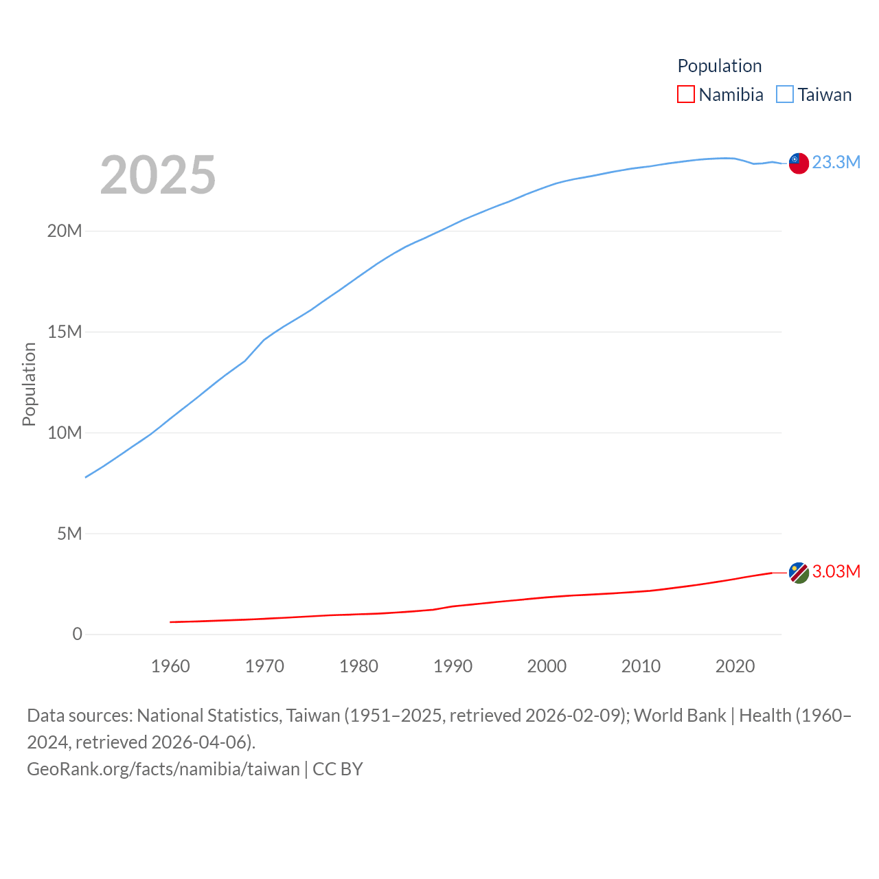 Namibia has a population of 3.03M (ranked 136/197), compared with 23.3M in Taiwan (ranked 60/197). Namibia's land area is 317,874 sq mi versus 13,976 sq mi for Taiwan (ranked 33rd vs. 133rd).