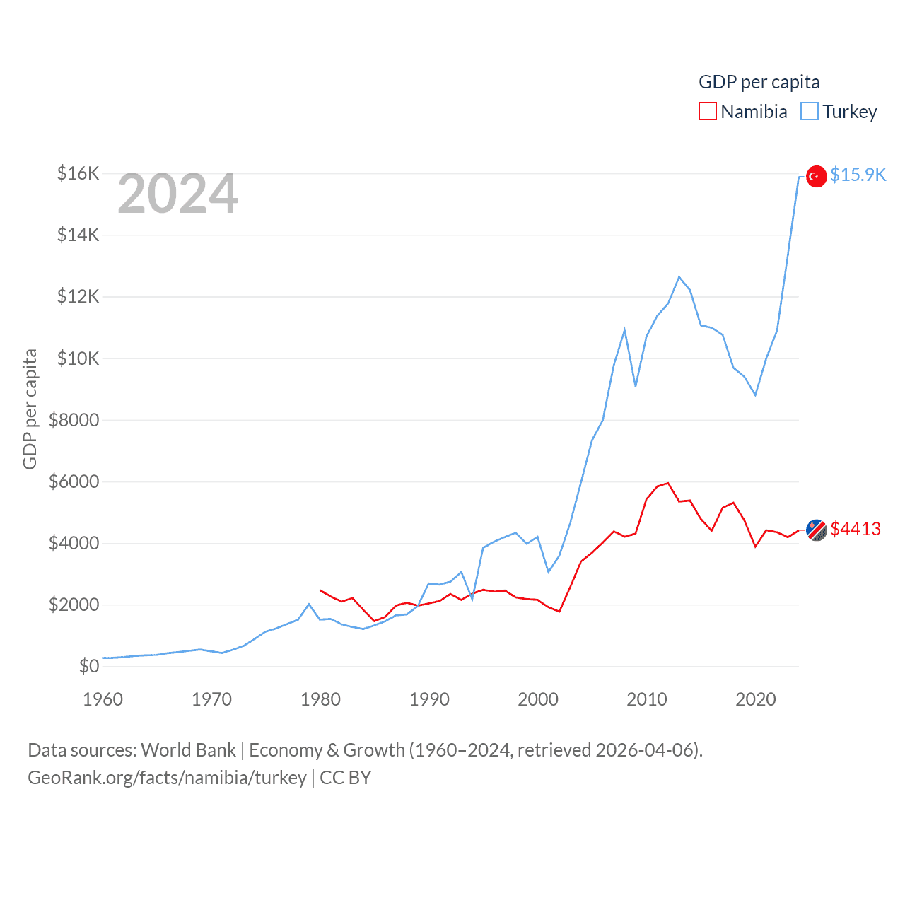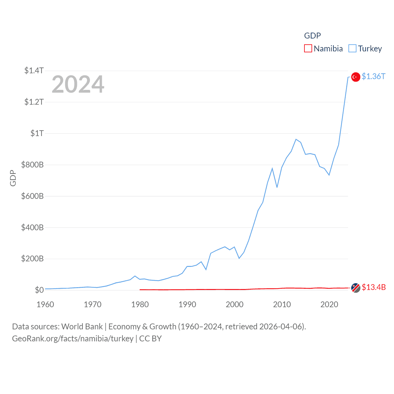 By GDP, Namibia ranks 147/197 ($13.4B) and Turkey ranks 17/197 ($1.36T). By GDP per capita, Namibia ranks 126/197 ($4,413), while Turkey ranks 66/197 ($15,893).