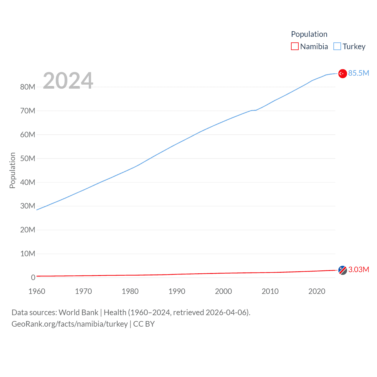 Namibia has a population of 3.03M (ranked 136/197), compared with 85.5M in Turkey (ranked 18/197). Namibia's land area is 317,874 sq mi versus 297,156 sq mi for Turkey (ranked 33rd vs. 36th).