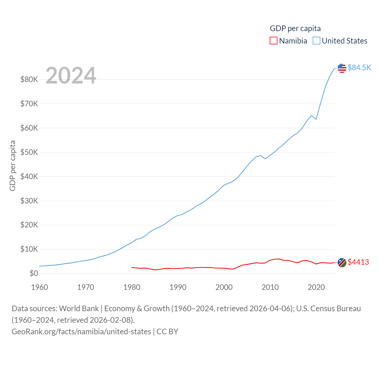 By GDP, Namibia ranks 147/197 ($13.4B) and The United States ranks 1/197 ($28.8T). By GDP per capita, Namibia ranks 126/197 ($4,413), while The United States ranks 10/197 ($84,534).