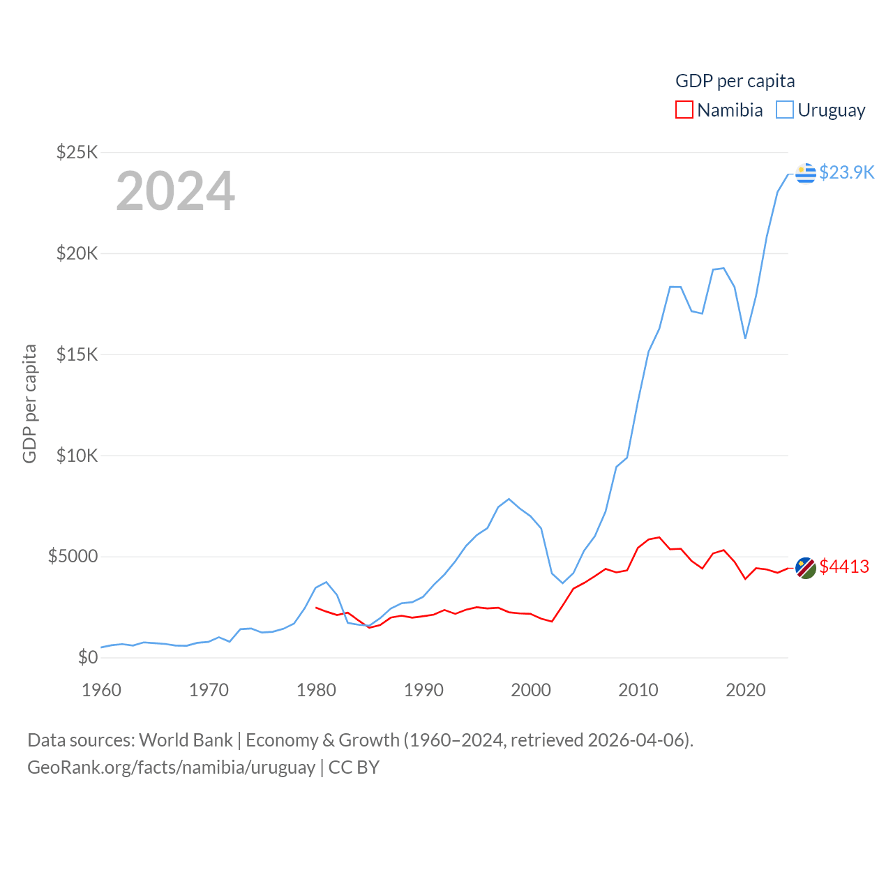 By GDP, Namibia ranks 147/197 ($13.4B) and Uruguay ranks 81/197 ($81B). By GDP per capita, Namibia ranks 126/197 ($4,413), while Uruguay ranks 52/197 ($23,907).