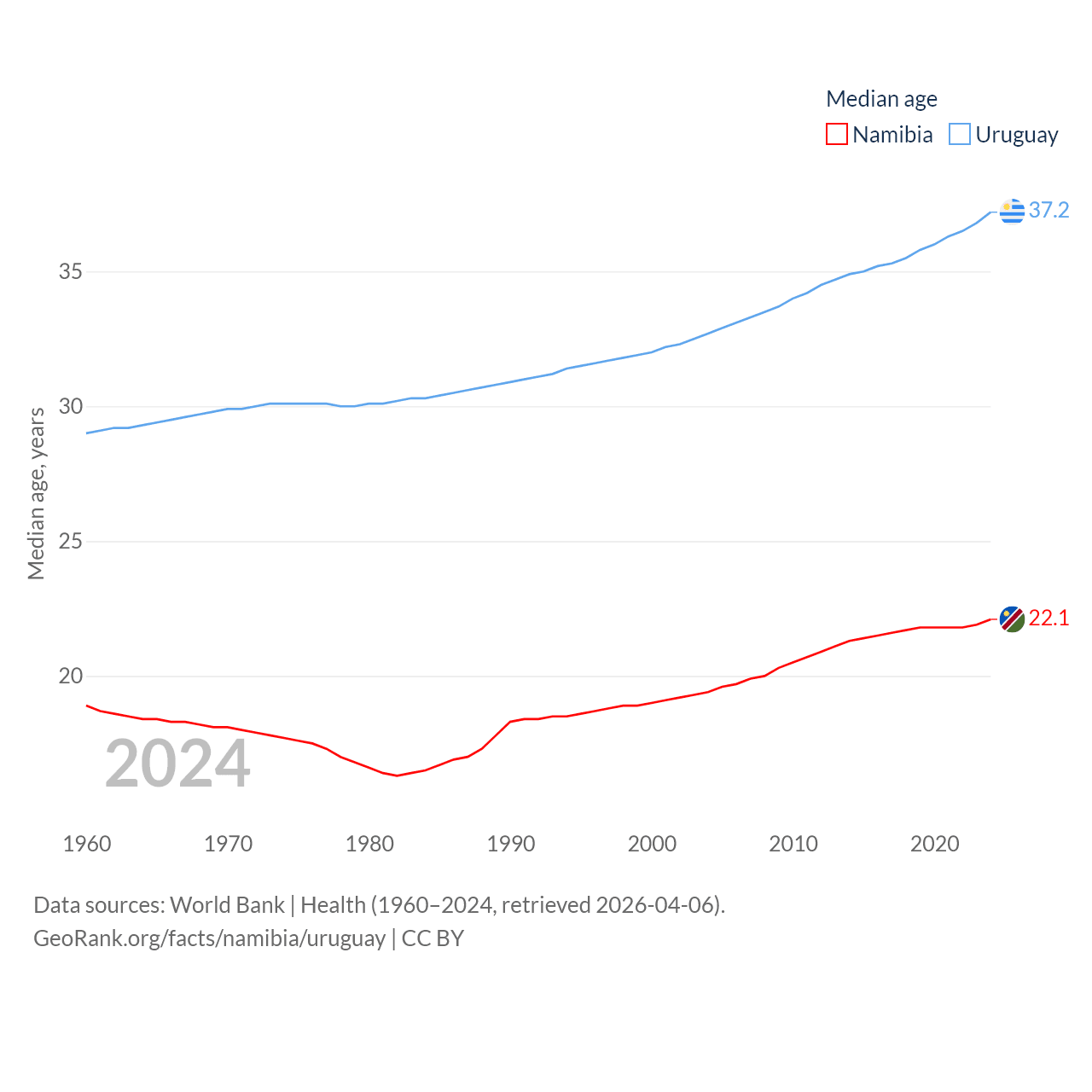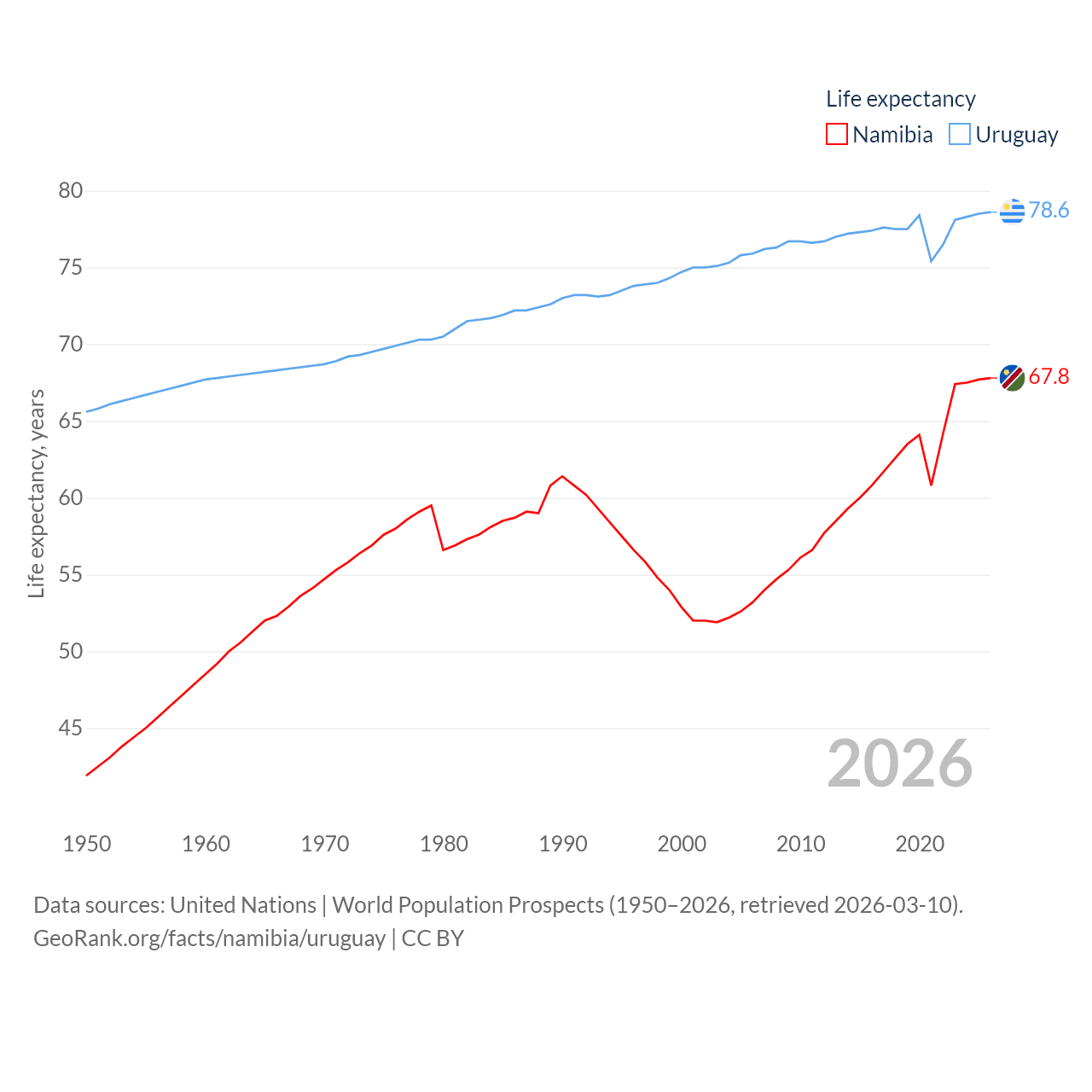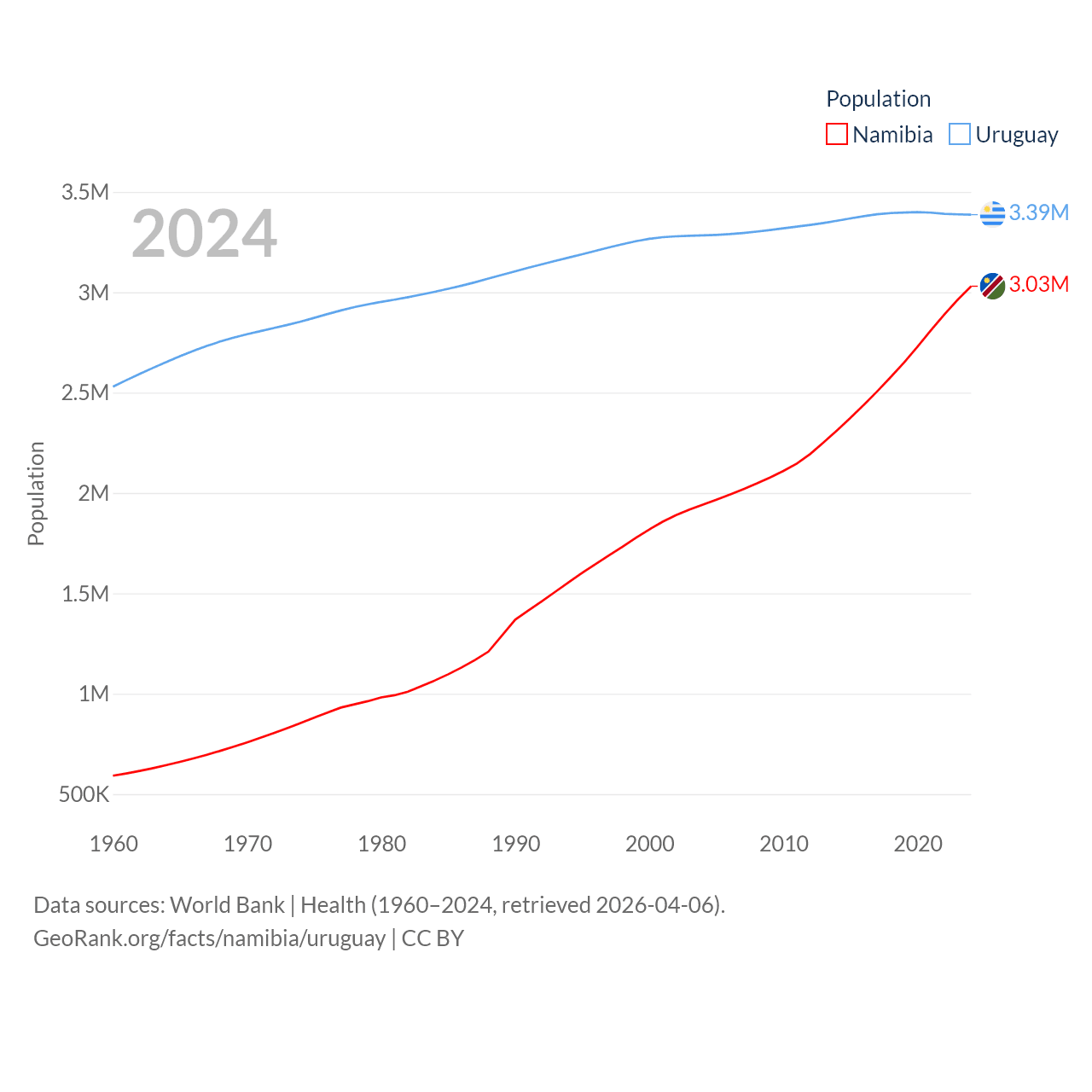 Namibia has a population of 3.03M (ranked 136/197), compared with 3.39M in Uruguay (ranked 133/197). Namibia's land area is 317,874 sq mi versus 67,576 sq mi for Uruguay (ranked 33rd vs. 89th).