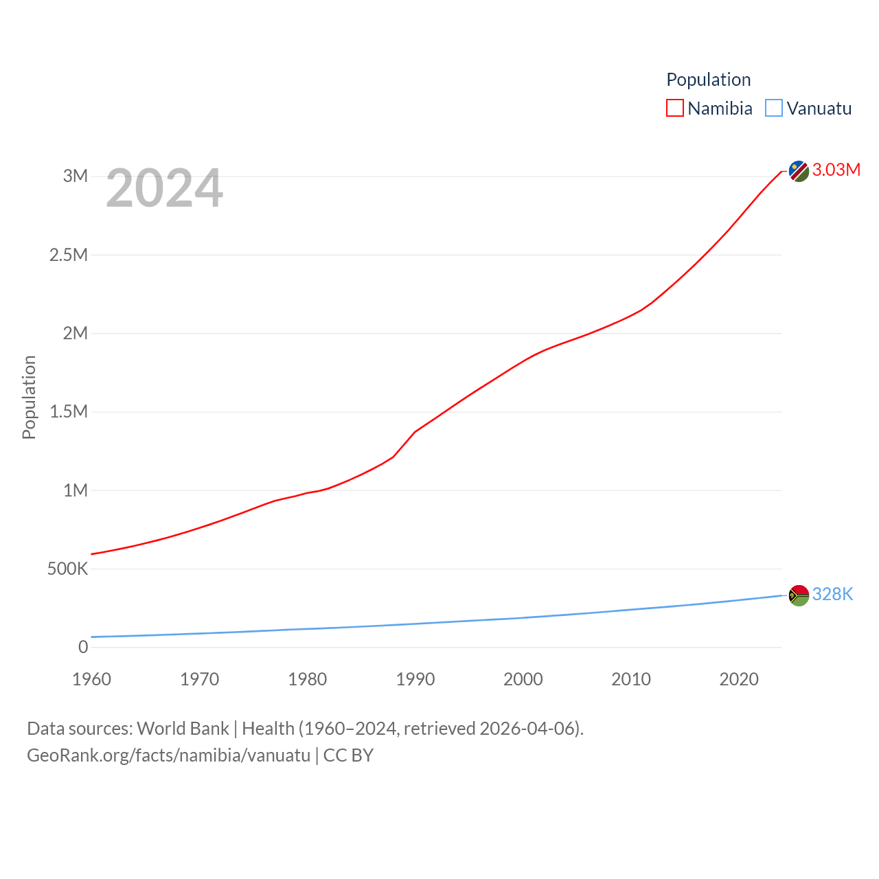 Namibia has a population of 3.03M (ranked 136/197), compared with 328K in Vanuatu (ranked 174/197). Namibia's land area is 317,874 sq mi versus 4,707 sq mi for Vanuatu (ranked 33rd vs. 157th).