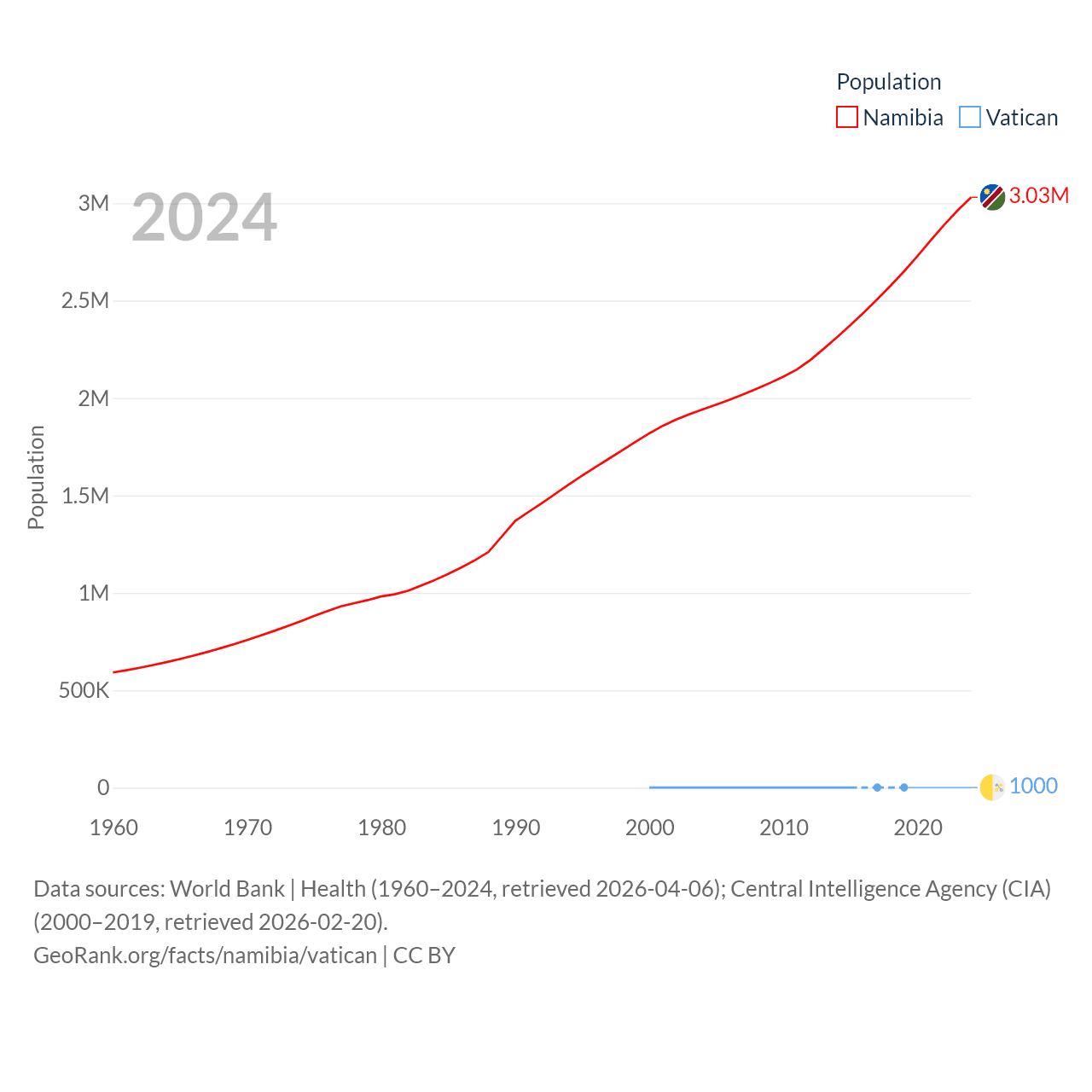 Namibia has a population of 3.03M (ranked 136/197), compared with 1K in The Vatican (ranked 197/197). Namibia's land area is 317,874 sq mi versus 0.17 sq mi for The Vatican (ranked 33rd vs. 197th).