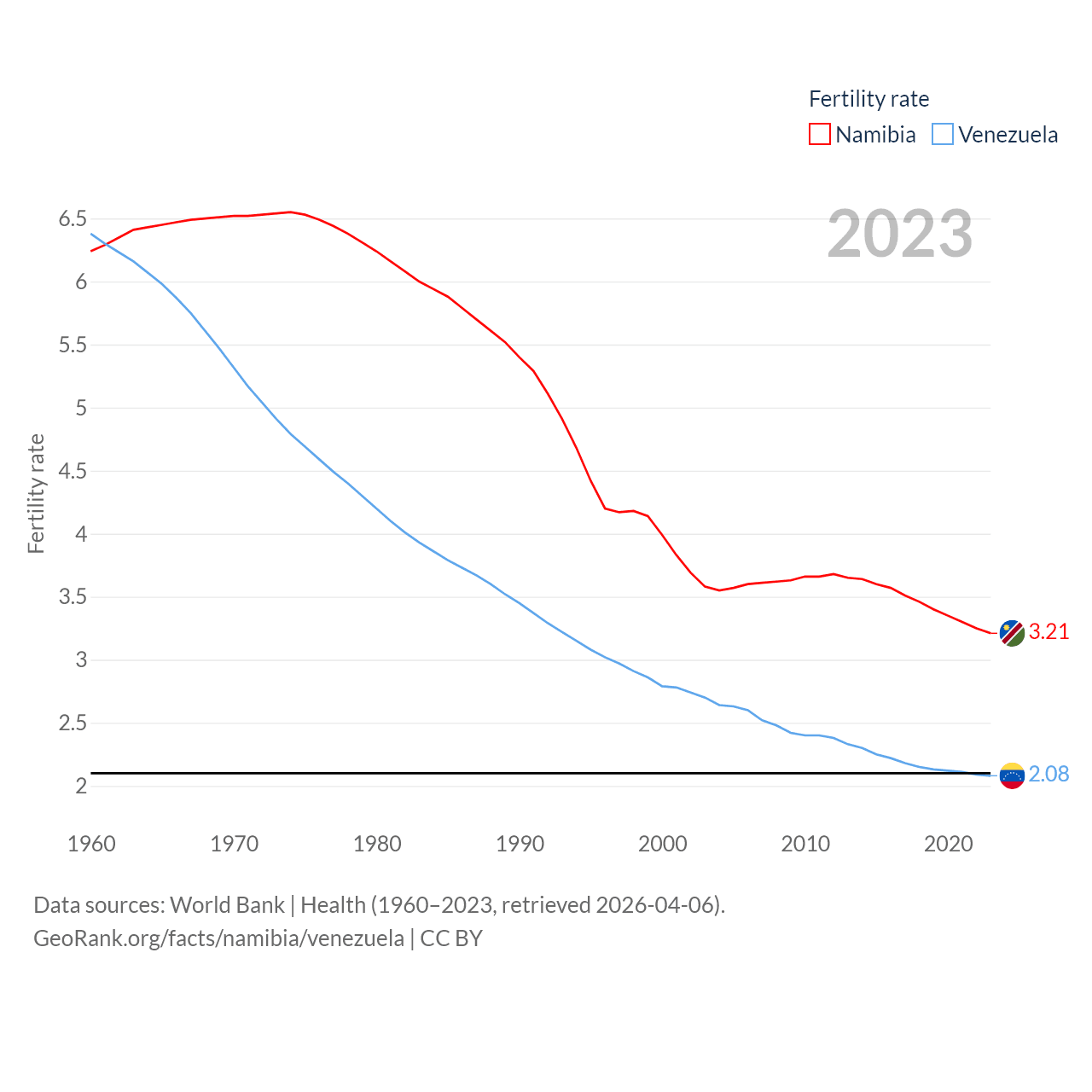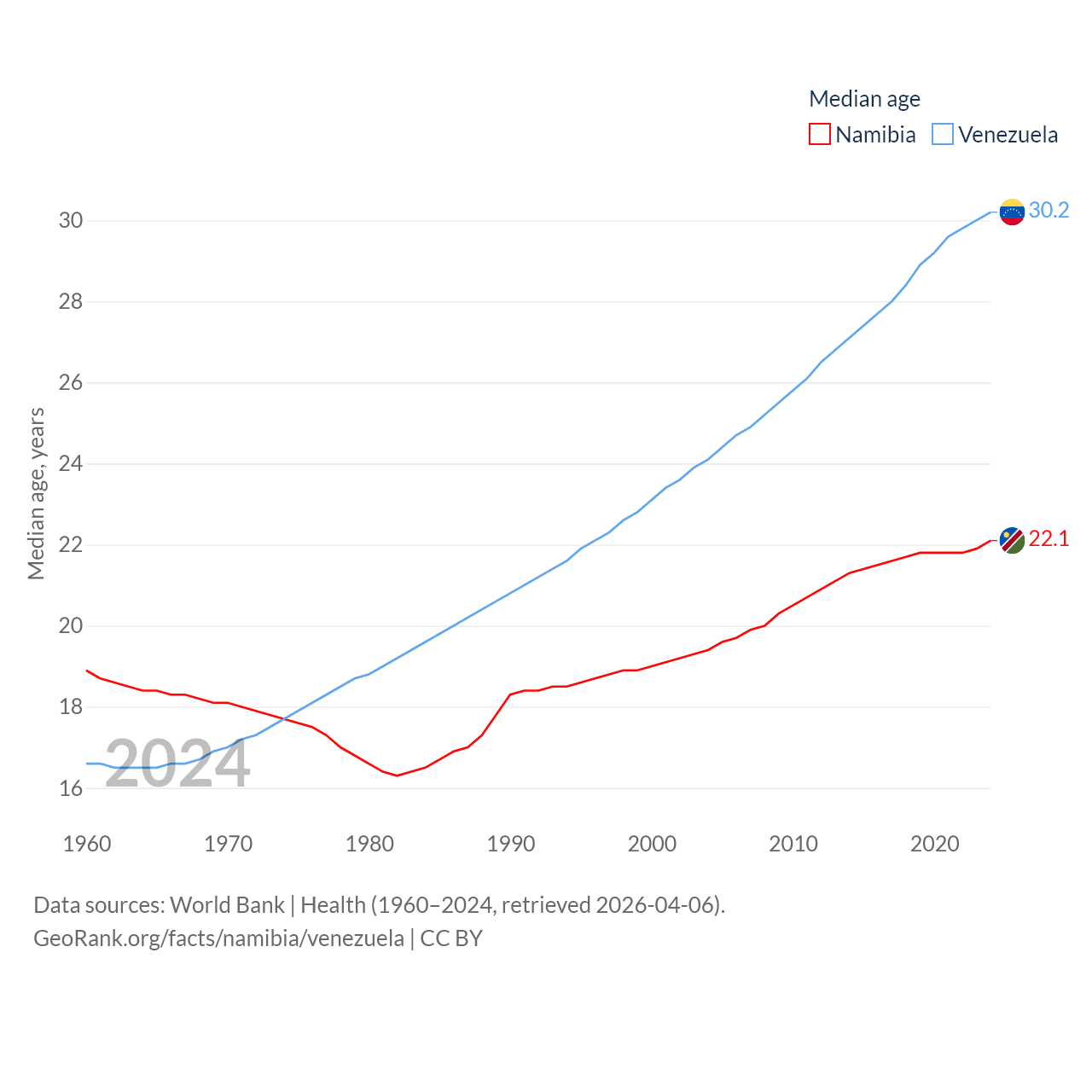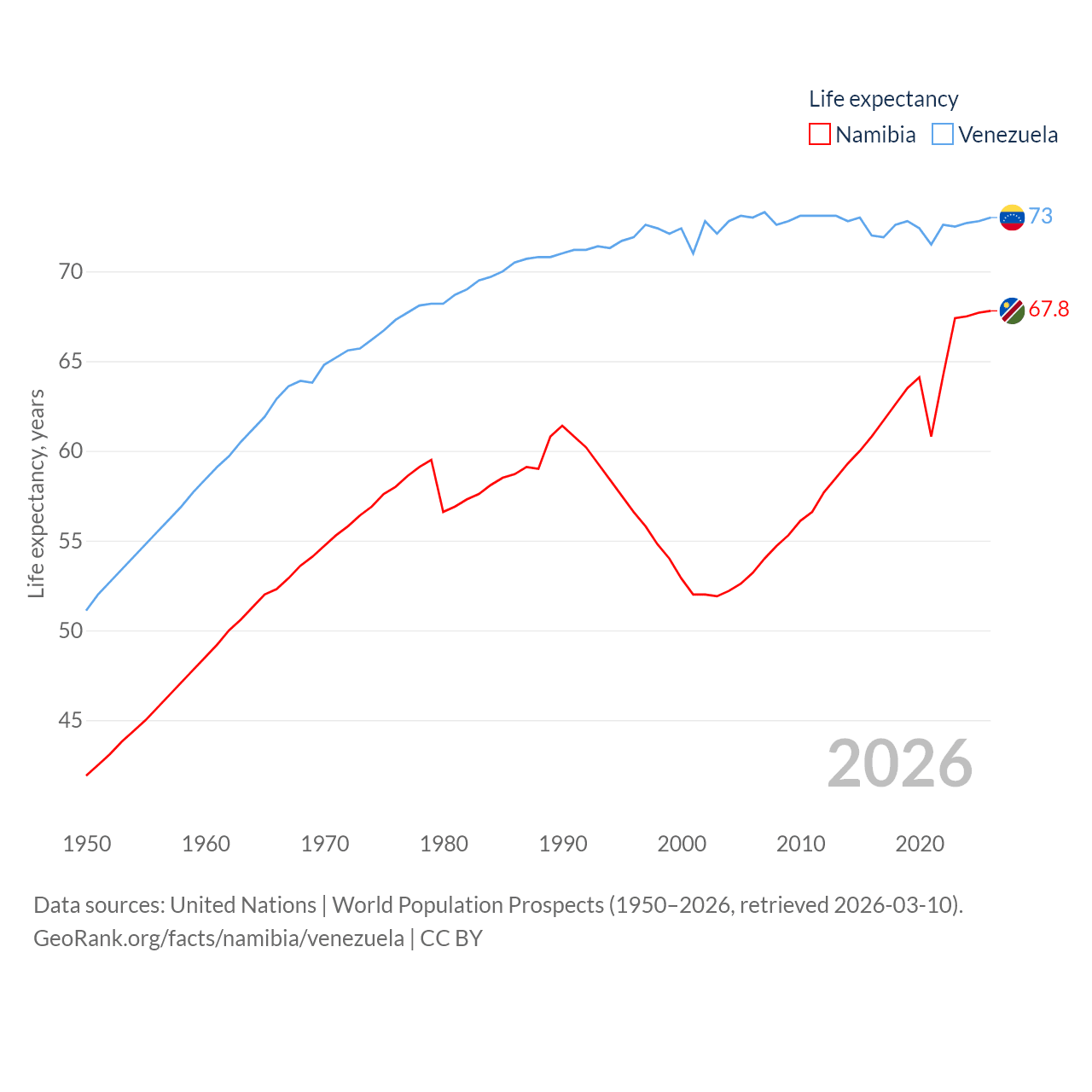 Namibia has a population of 3.03M (ranked 136/197), compared with 28.4M in Venezuela (ranked 53/197). Namibia's land area is 317,874 sq mi versus 340,561 sq mi for Venezuela (ranked 33rd vs. 32nd).
