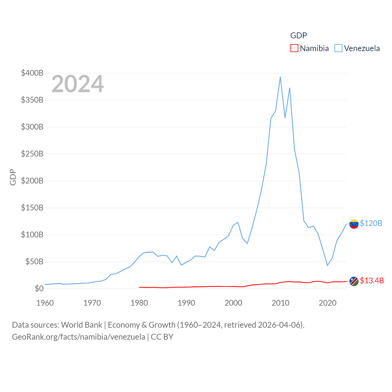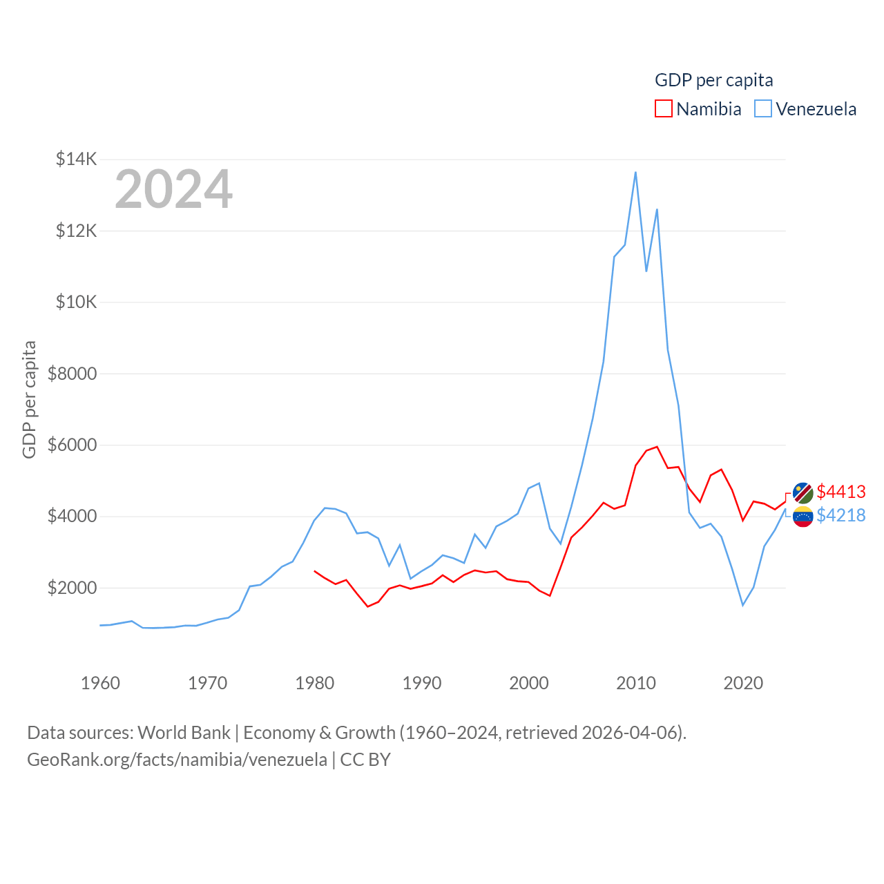 By GDP, Namibia ranks 147/197 ($13.4B) and Venezuela ranks 65/197 ($120B). By GDP per capita, Namibia ranks 126/197 ($4,413), while Venezuela ranks 128/197 ($4,218).