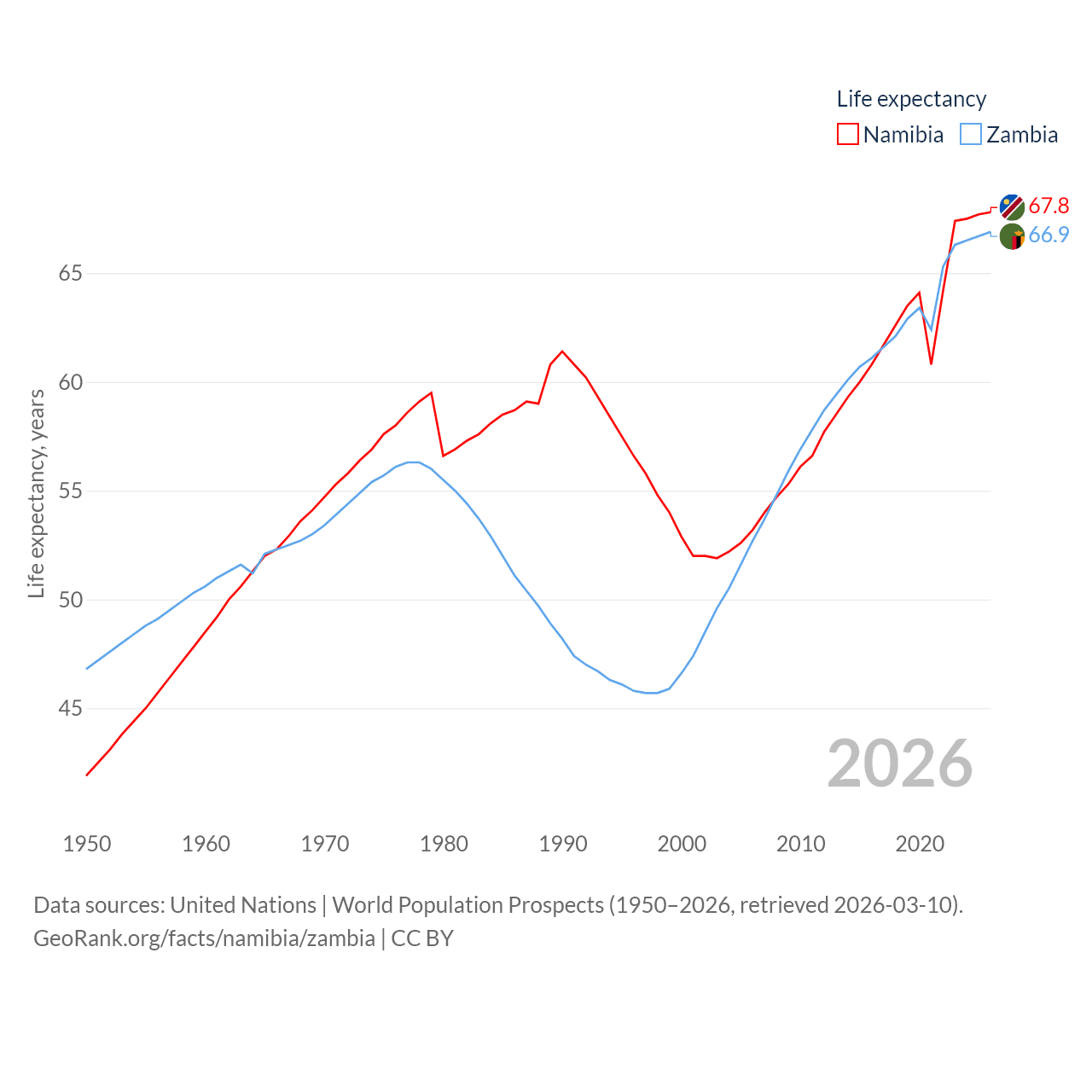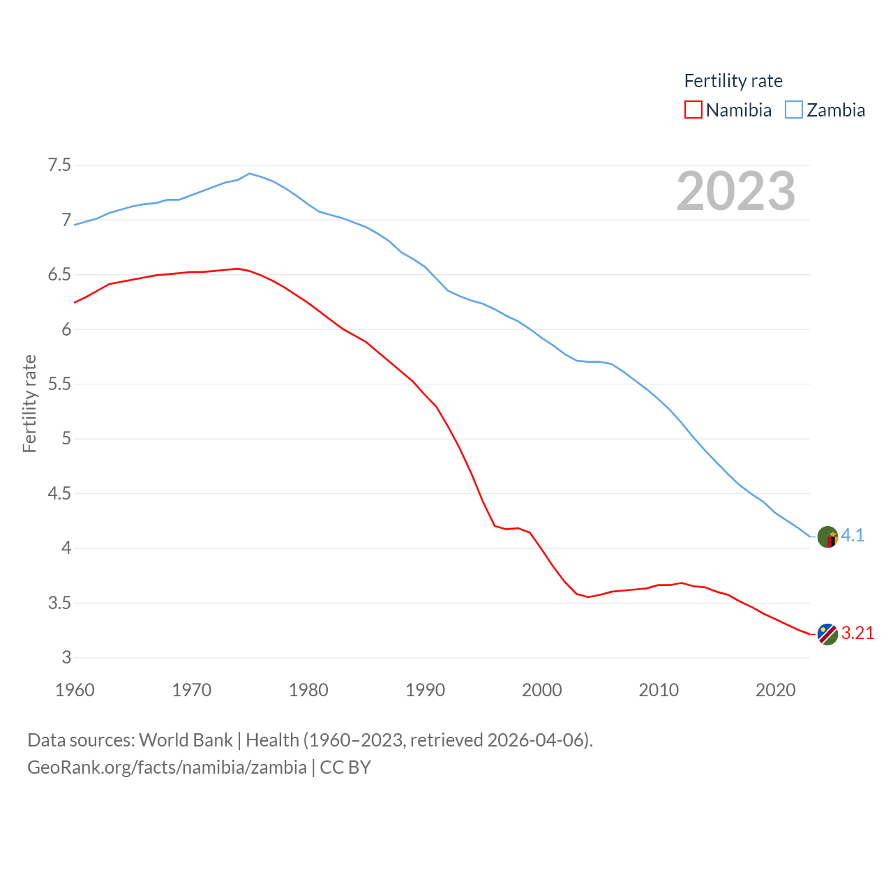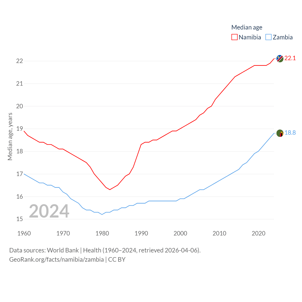 Namibia has a population of 3.03M (ranked 136/197), compared with 21.3M in Zambia (ranked 63/197). Namibia's land area is 317,874 sq mi versus 287,024 sq mi for Zambia (ranked 33rd vs. 37th).