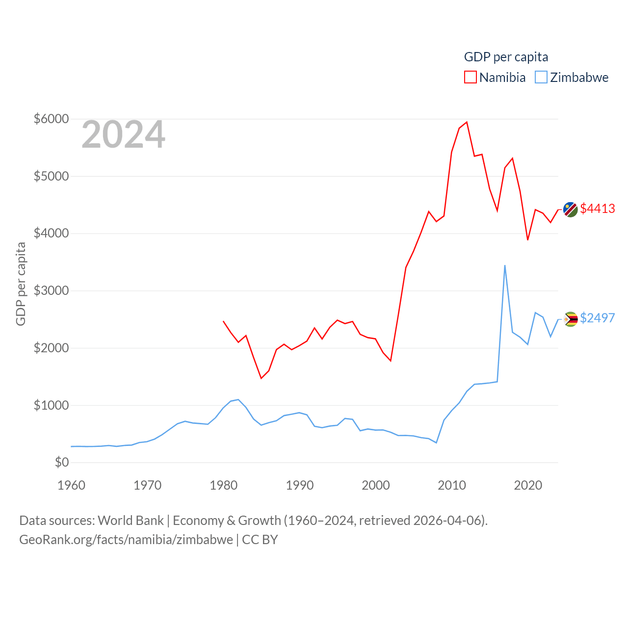 By GDP, Namibia ranks 147/197 ($13.4B) and Zimbabwe ranks 102/197 ($41.5B). By GDP per capita, Namibia ranks 126/197 ($4,413), while Zimbabwe ranks 148/197 ($2,497).