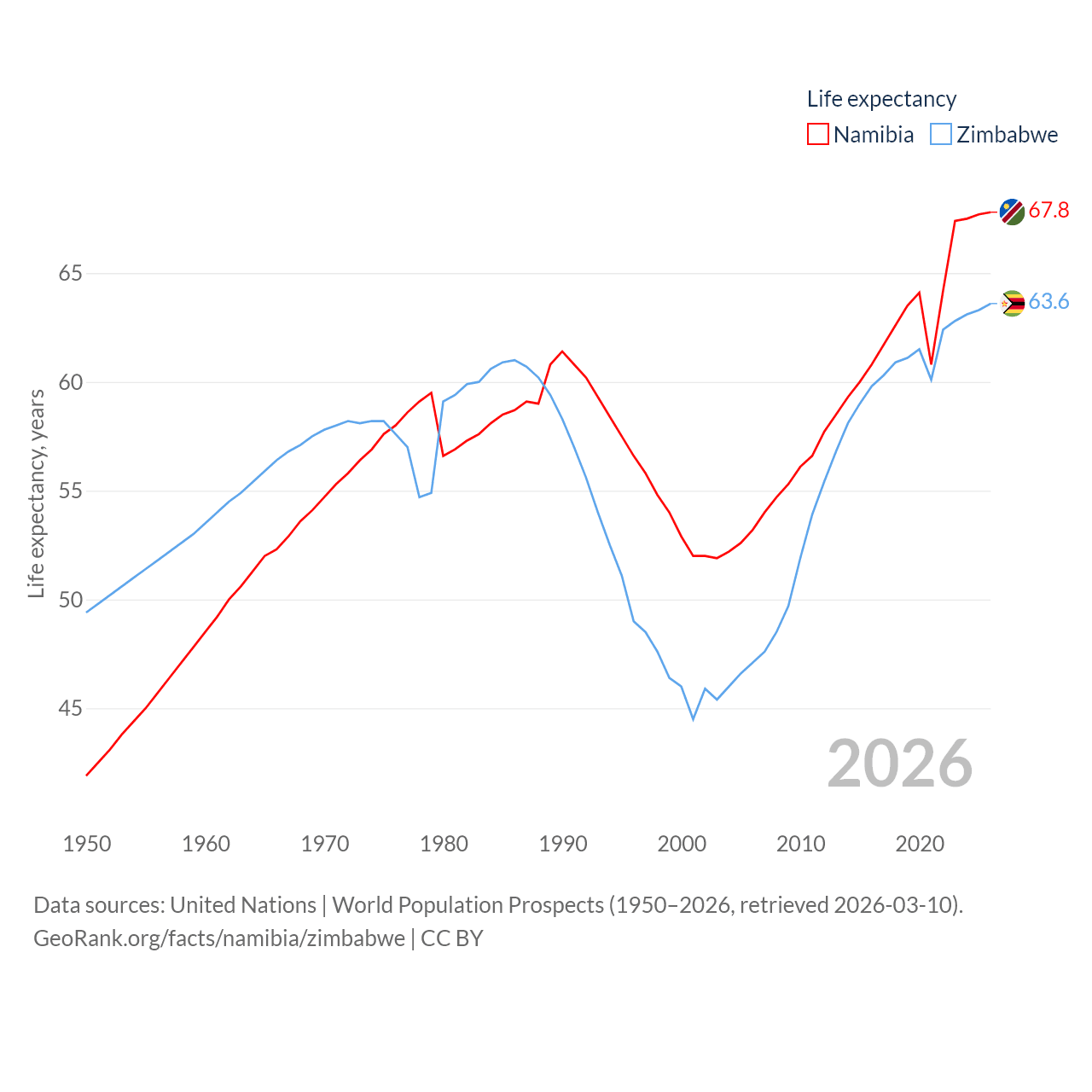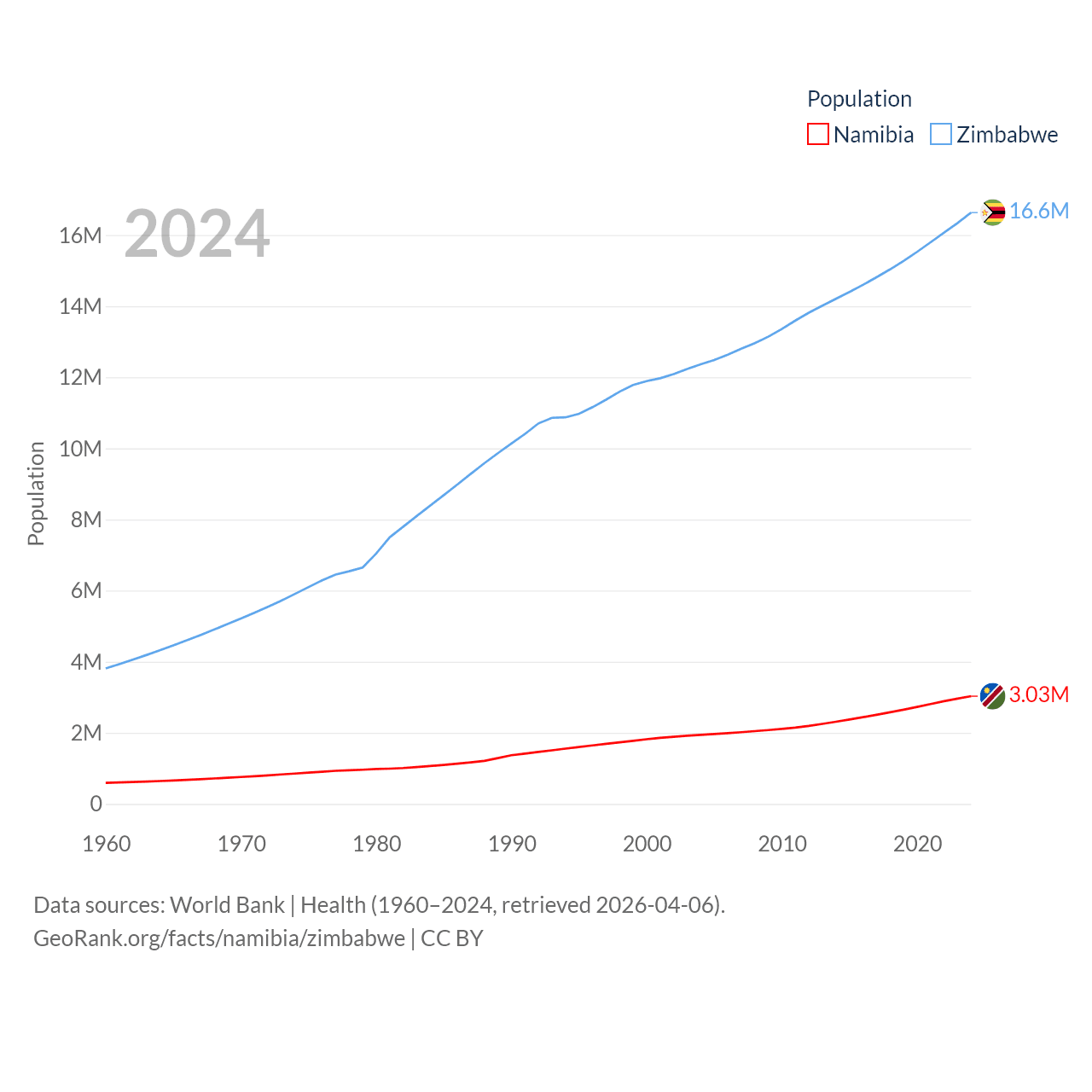 Namibia has a population of 3.03M (ranked 136/197), compared with 16.6M in Zimbabwe (ranked 74/197). Namibia's land area is 317,874 sq mi versus 149,364 sq mi for Zimbabwe (ranked 33rd vs. 60th).
