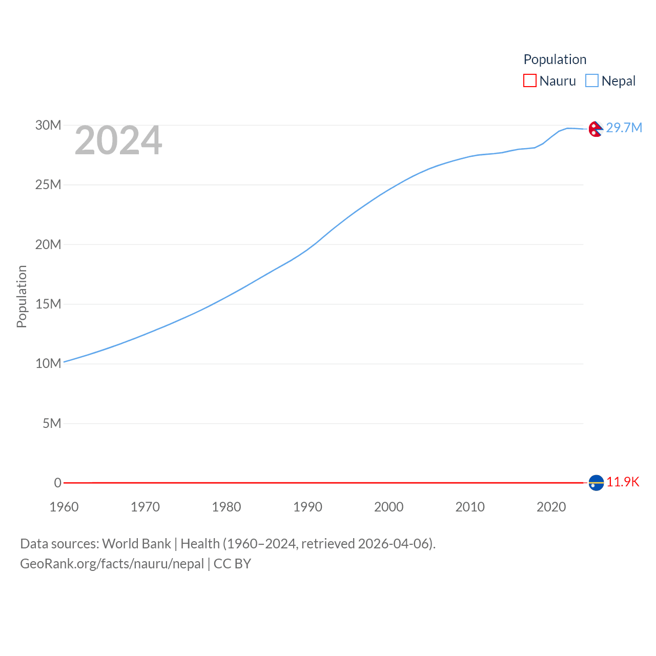 Nauru has a population of 11.9K (ranked 195/197), compared with 29.7M in Nepal (ranked 51/197). Nauru's land area is 7.72 sq mi versus 55,348 sq mi for Nepal (ranked 195th vs. 92nd).