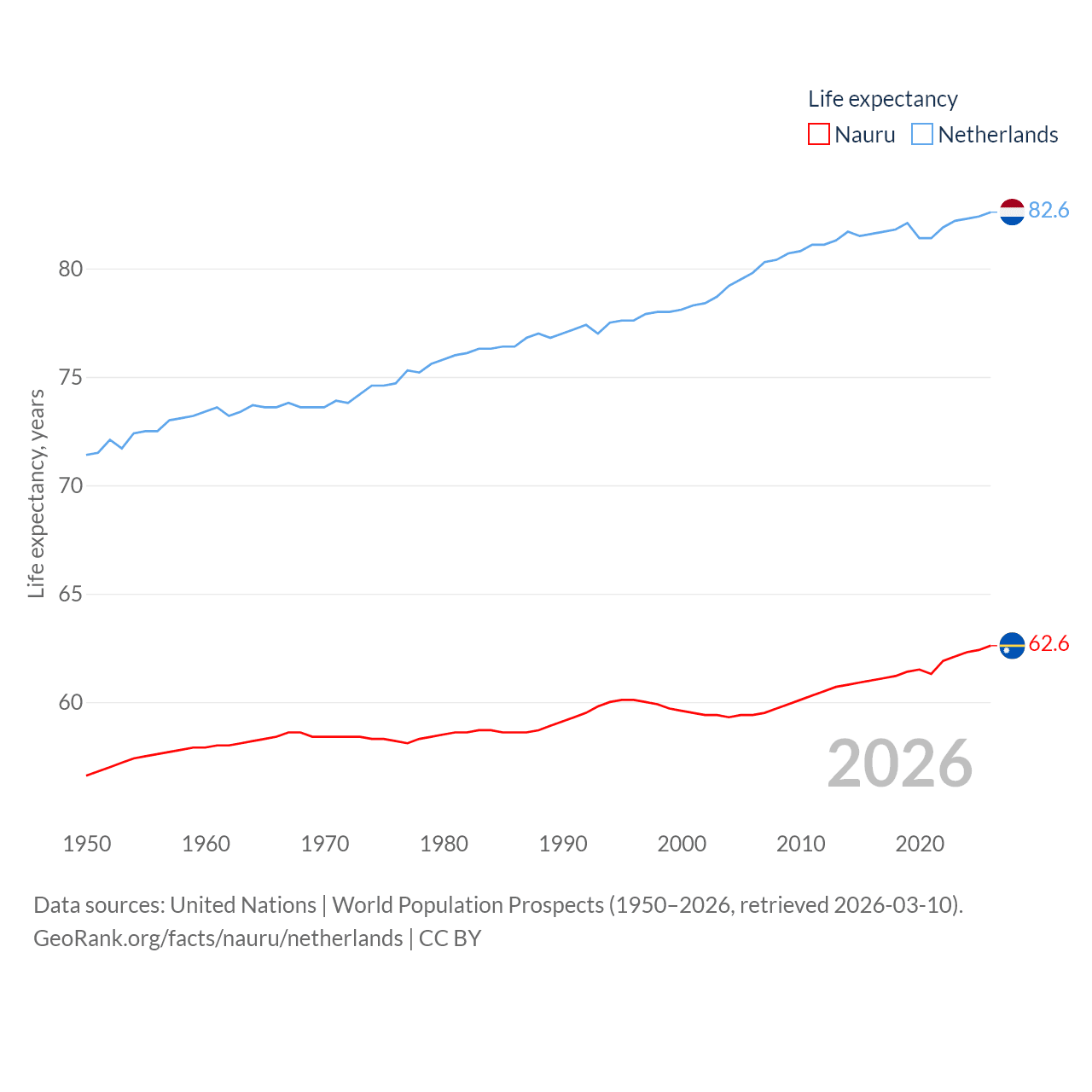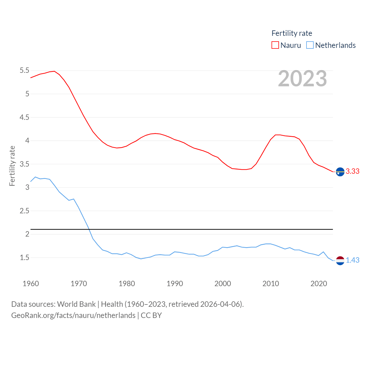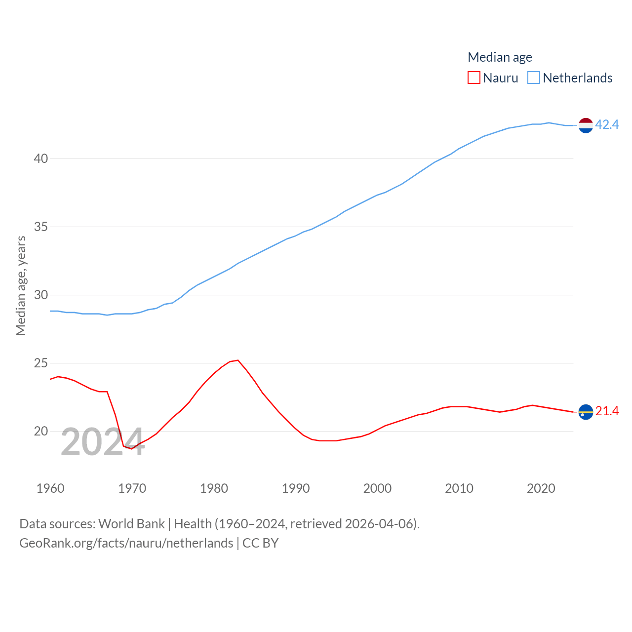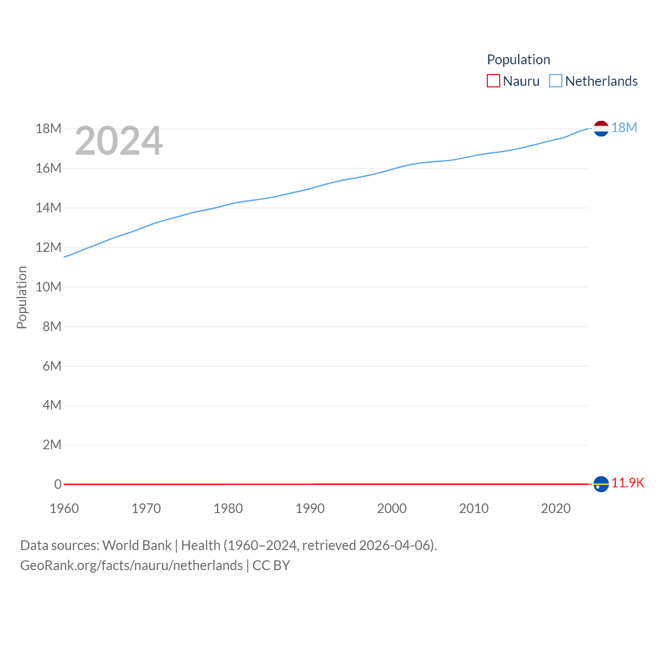 Nauru has a population of 11.9K (ranked 195/197), compared with 18M in The Netherlands (ranked 72/197). Nauru's land area is 7.72 sq mi versus 13,000 sq mi for The Netherlands (ranked 195th vs. 134th).