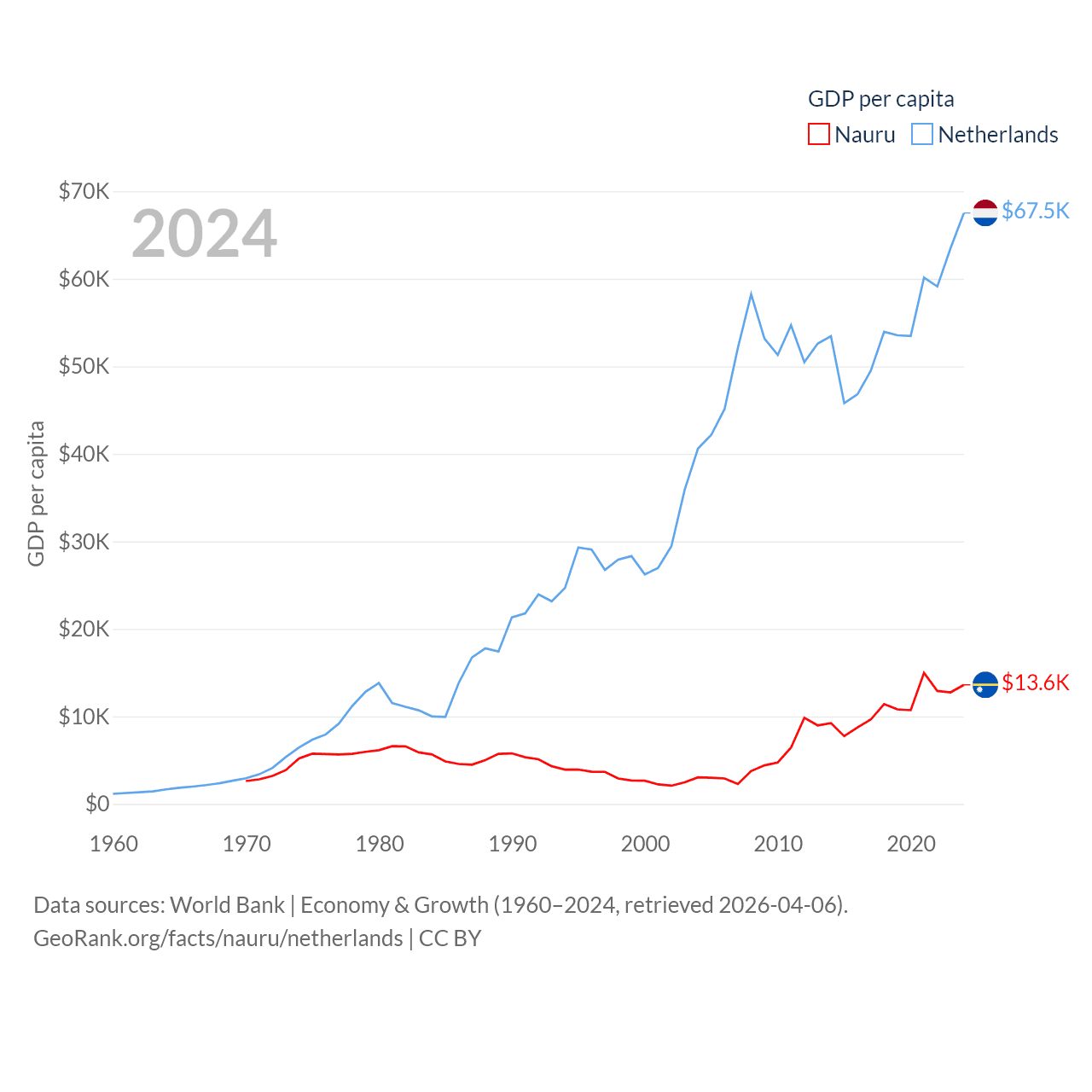 By GDP, Nauru ranks 195/197 ($163M) and The Netherlands ranks 19/197 ($1.21T). By GDP per capita, Nauru ranks 74/197 ($13,609), while The Netherlands ranks 13/197 ($67,520).