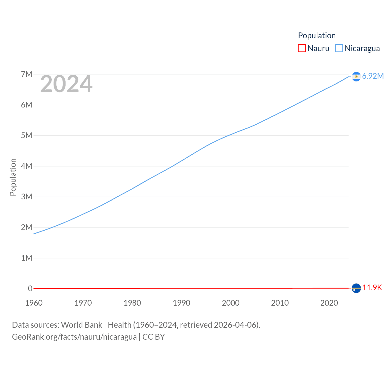 Nauru has a population of 11.9K (ranked 195/197), compared with 6.92M in Nicaragua (ranked 108/197). Nauru's land area is 7.72 sq mi versus 46,464 sq mi for Nicaragua (ranked 195th vs. 98th).