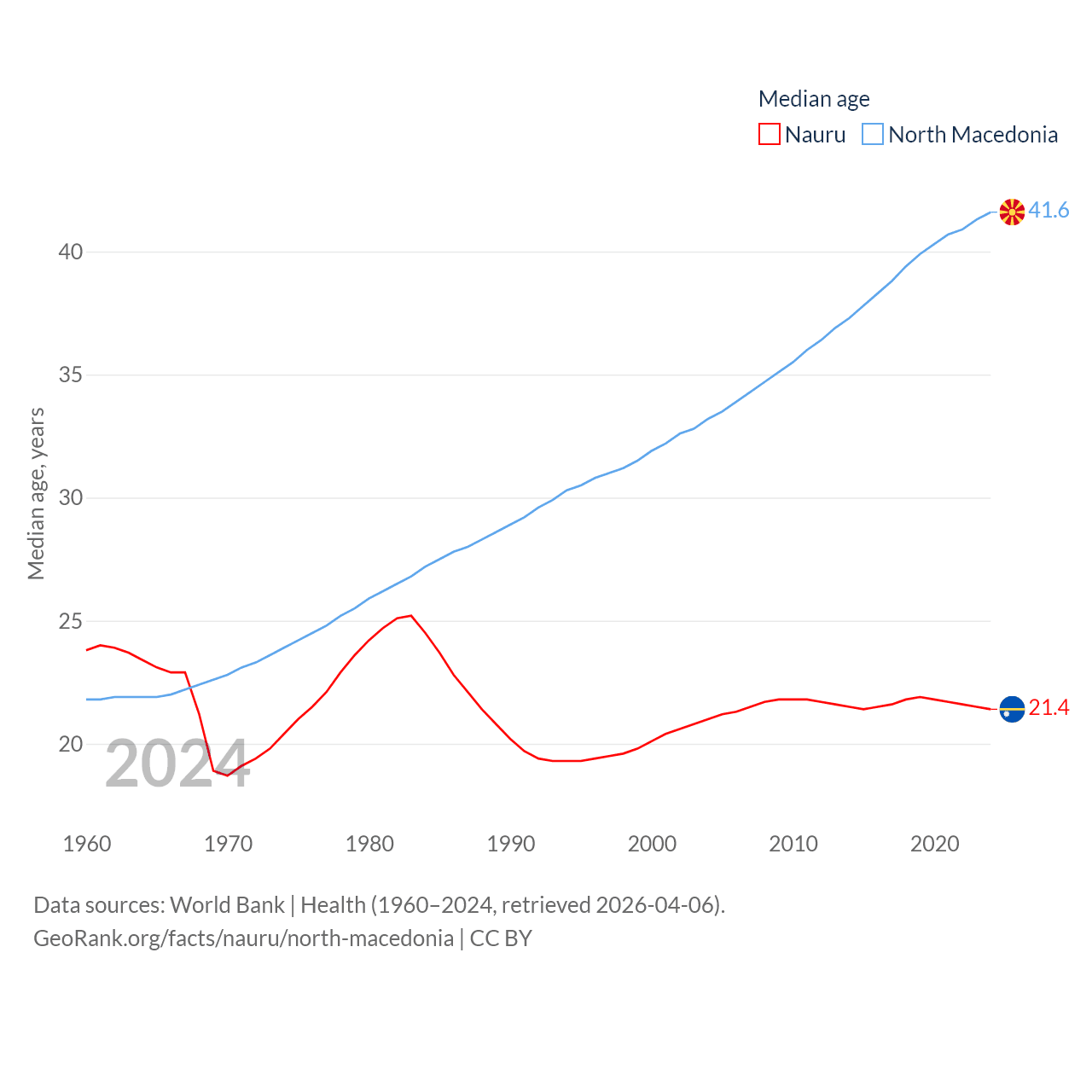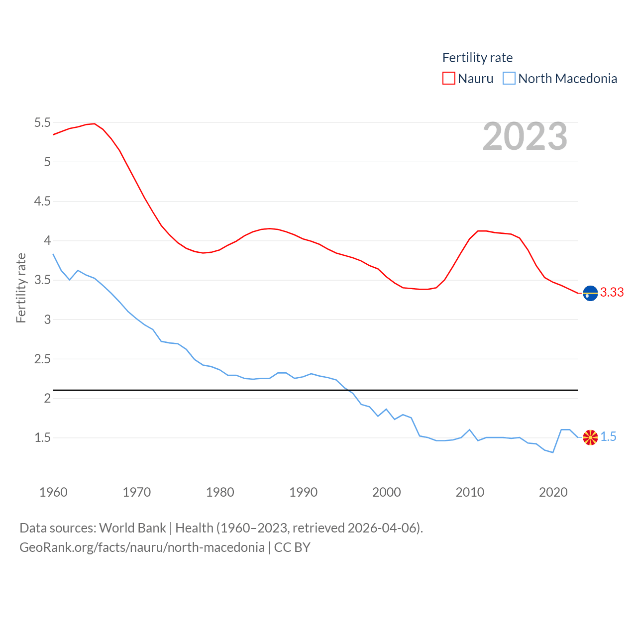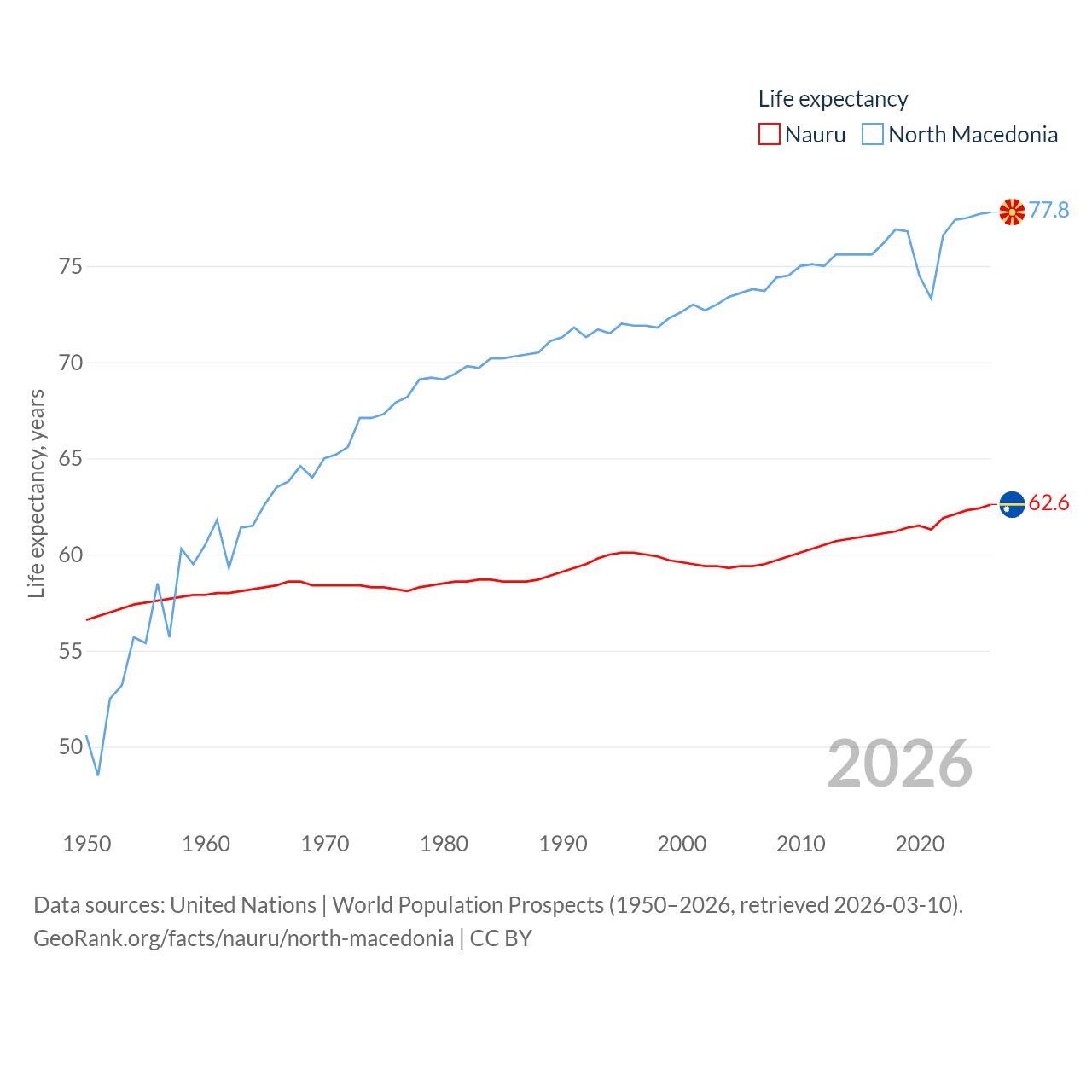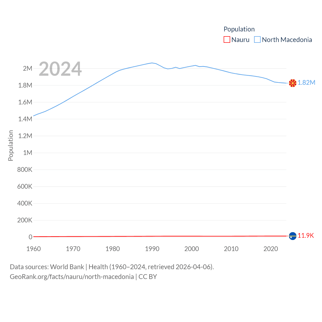 Nauru has a population of 11.9K (ranked 195/197), compared with 1.82M in North Macedonia (ranked 150/197). Nauru's land area is 7.72 sq mi versus 9,737 sq mi for North Macedonia (ranked 195th vs. 145th).