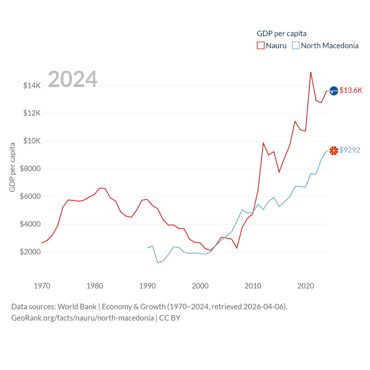 By GDP, Nauru ranks 195/197 ($163M) and North Macedonia ranks 138/197 ($17B). By GDP per capita, Nauru ranks 74/197 ($13,609), while North Macedonia ranks 88/197 ($9,292).