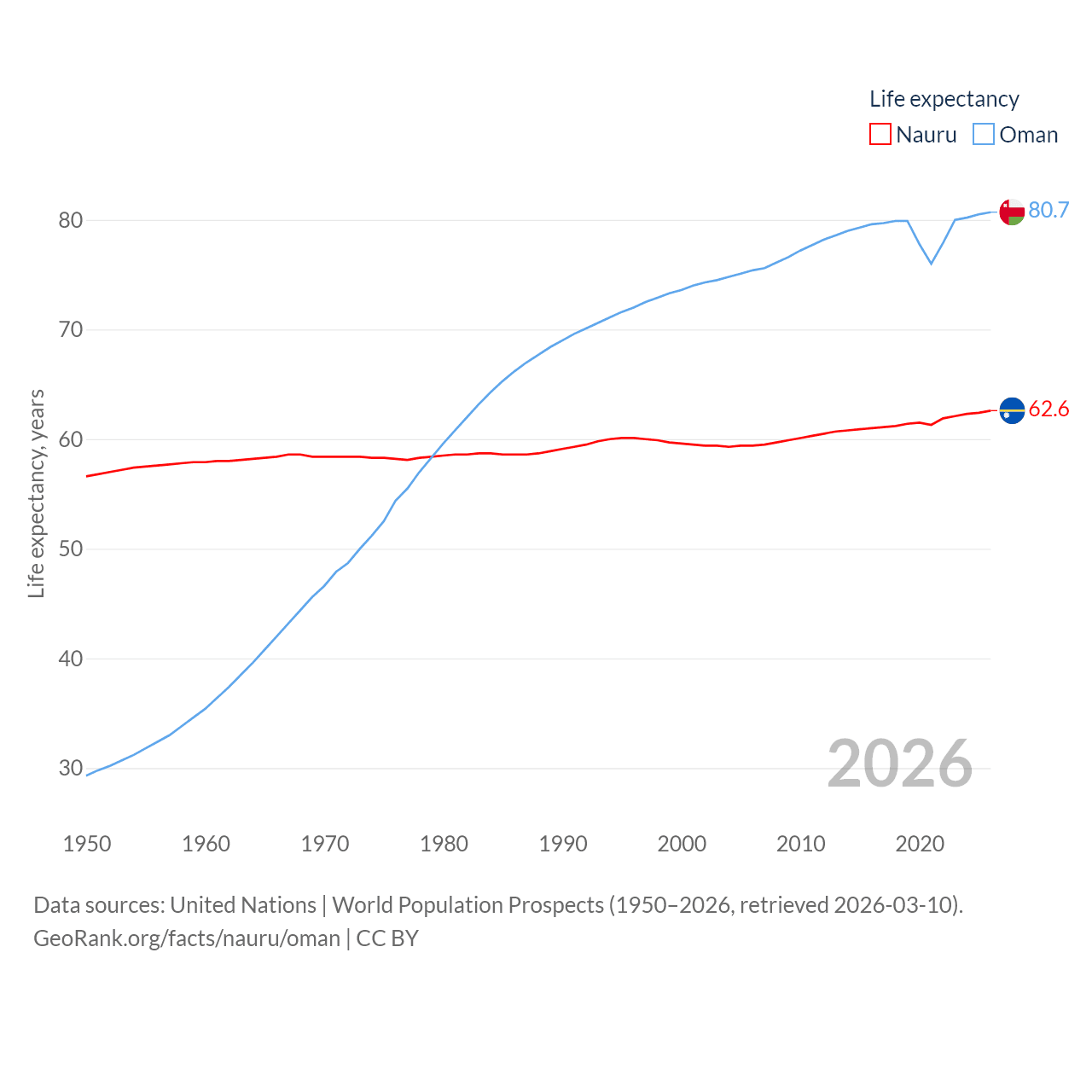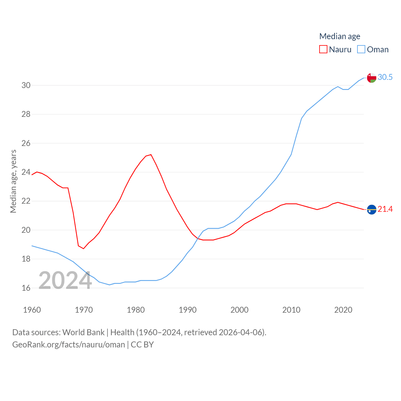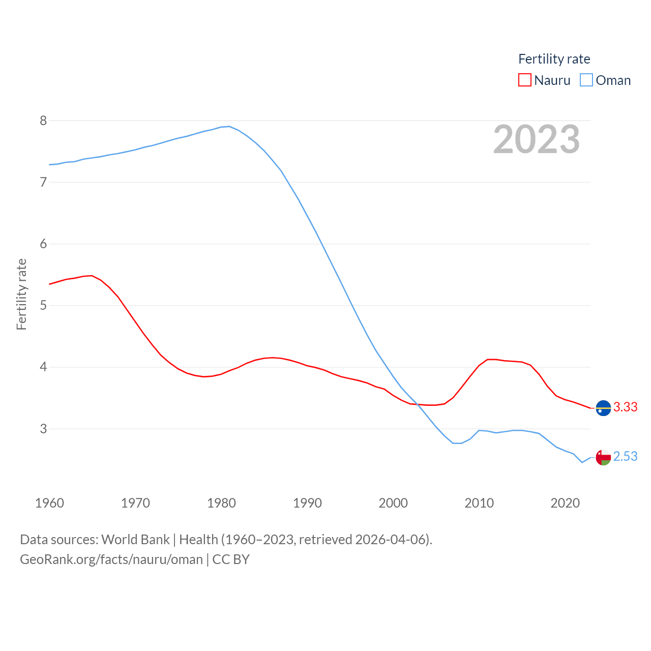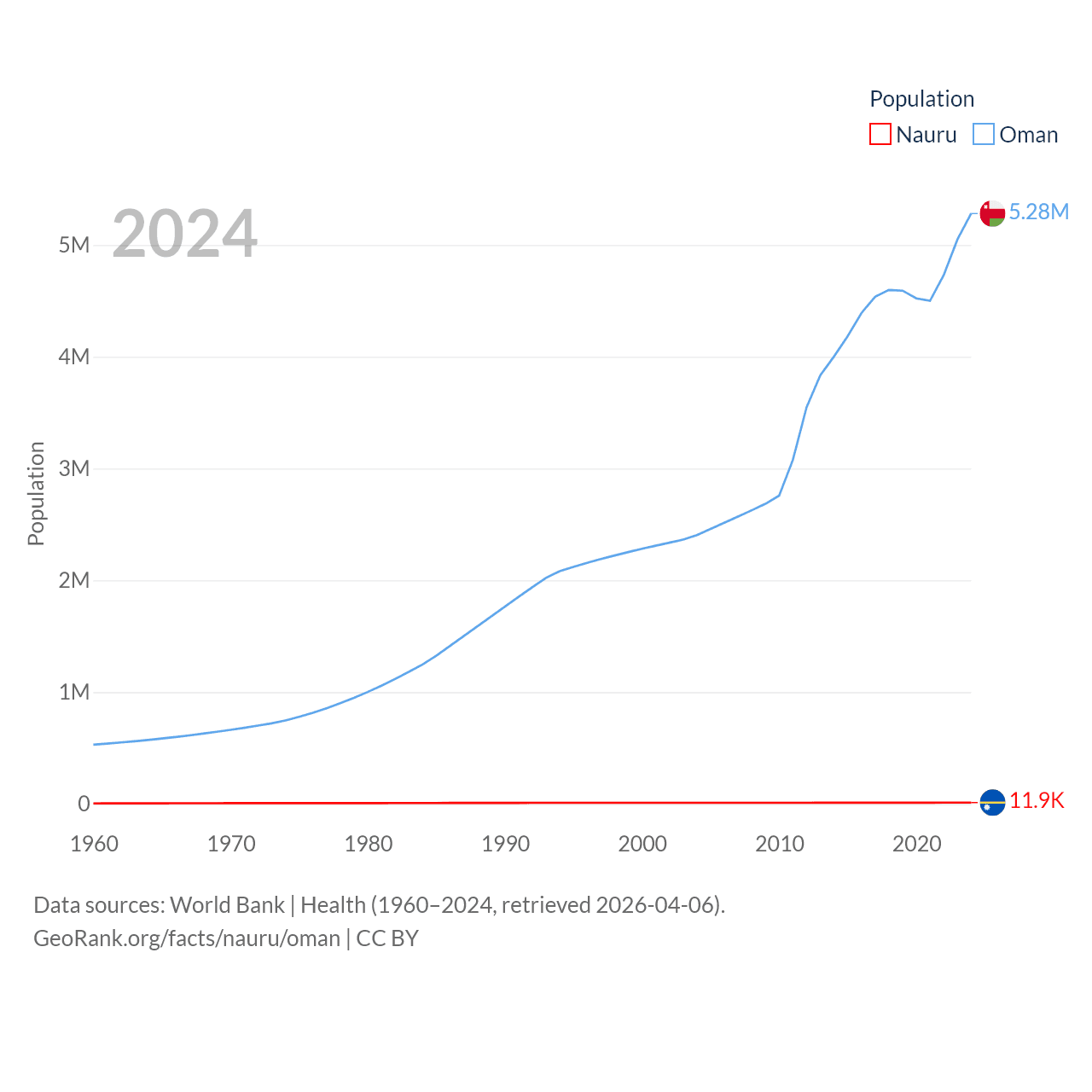 Nauru has a population of 11.9K (ranked 195/197), compared with 5.28M in Oman (ranked 124/197). Nauru's land area is 7.72 sq mi versus 119,499 sq mi for Oman (ranked 195th vs. 68th).