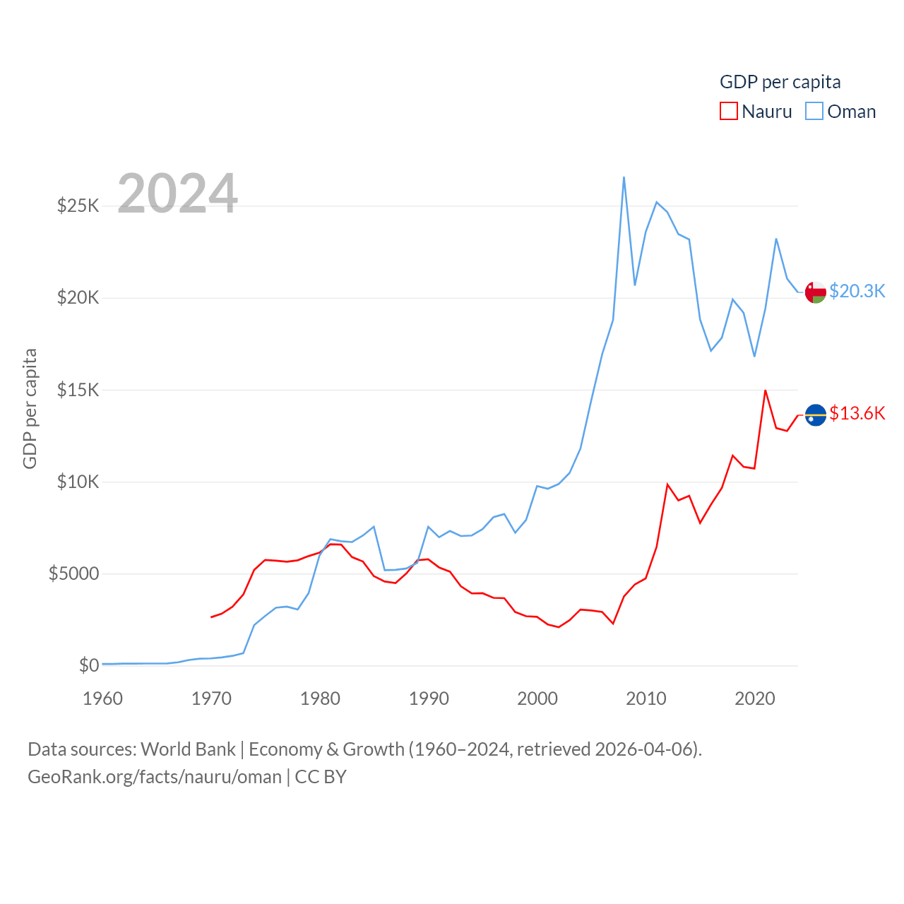 By GDP, Nauru ranks 195/197 ($163M) and Oman ranks 70/197 ($107B). By GDP per capita, Nauru ranks 74/197 ($13,609), while Oman ranks 57/197 ($20,285).