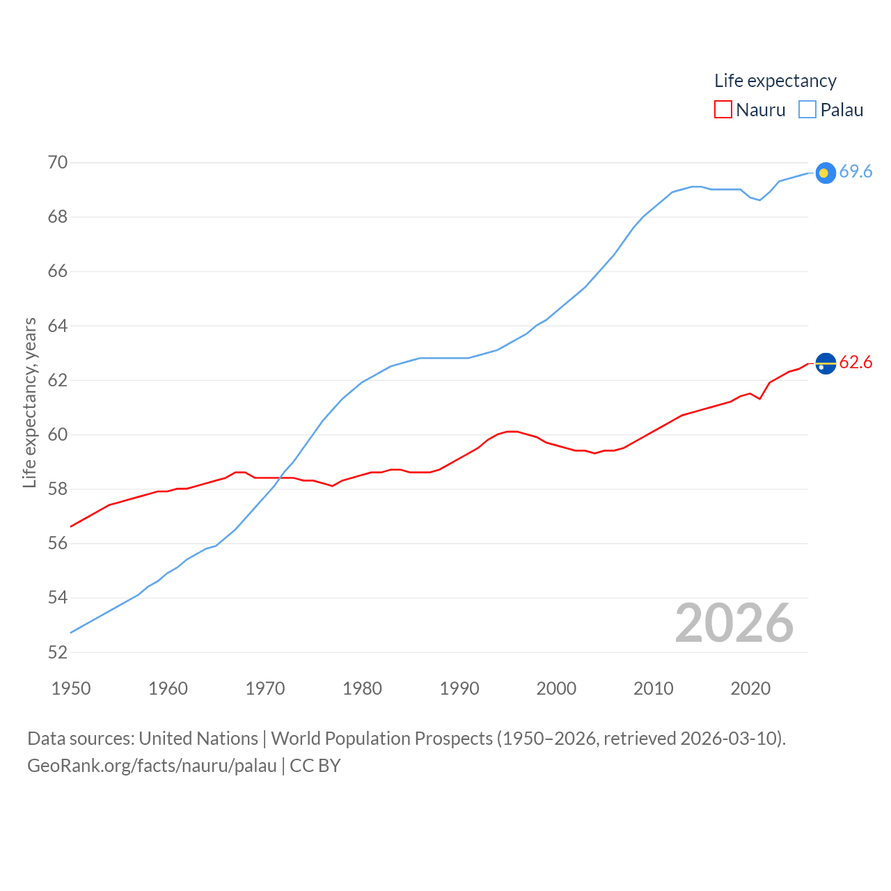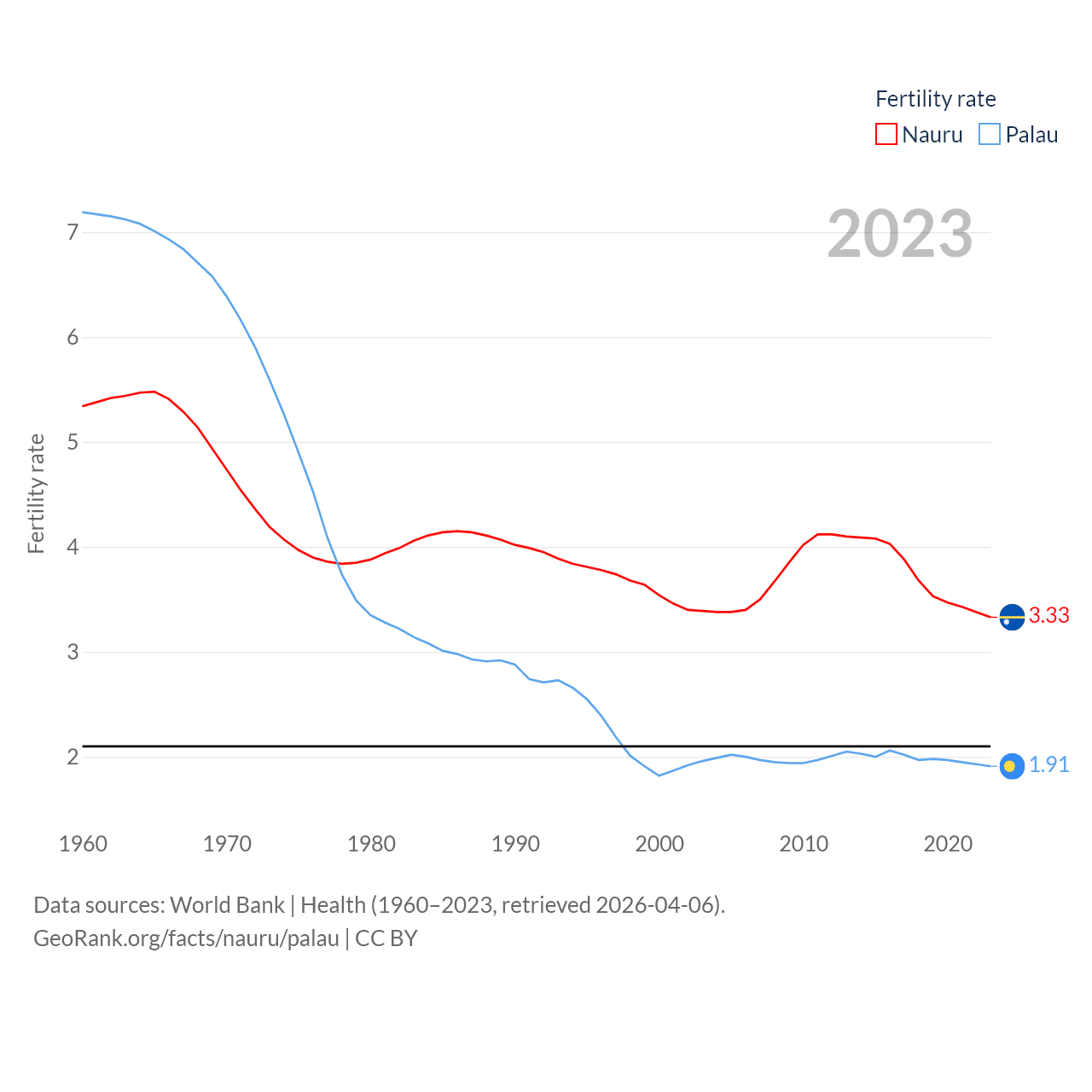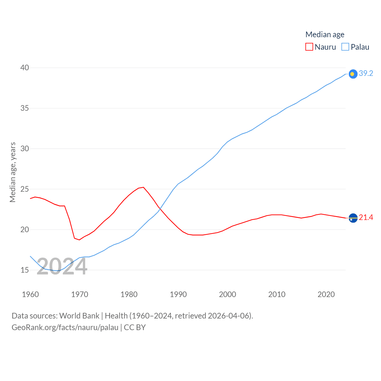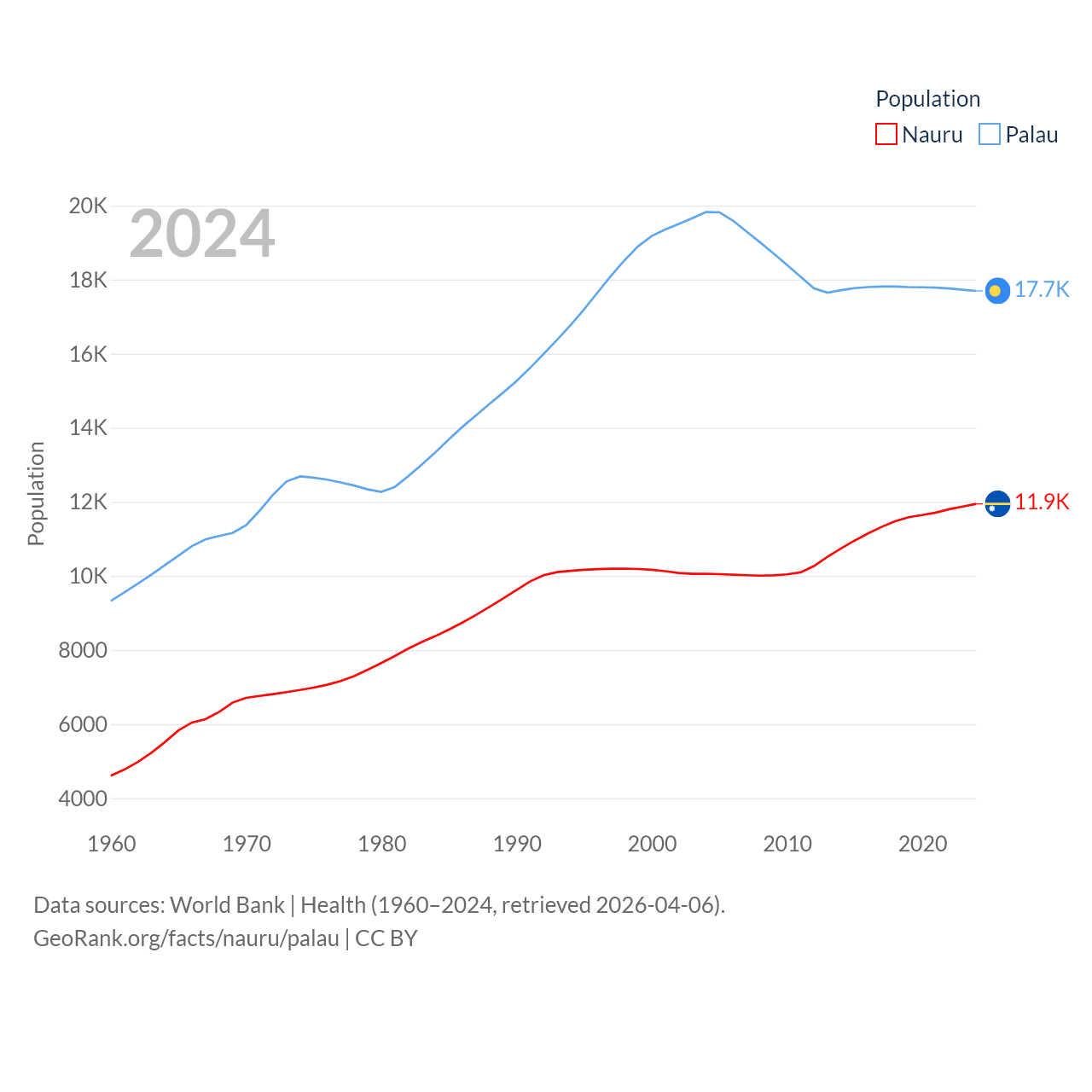 Nauru has a population of 11.9K (ranked 195/197), compared with 17.7K in Palau (ranked 194/197). Nauru's land area is 7.72 sq mi versus 177.6 sq mi for Palau (ranked 195th vs. 180th).