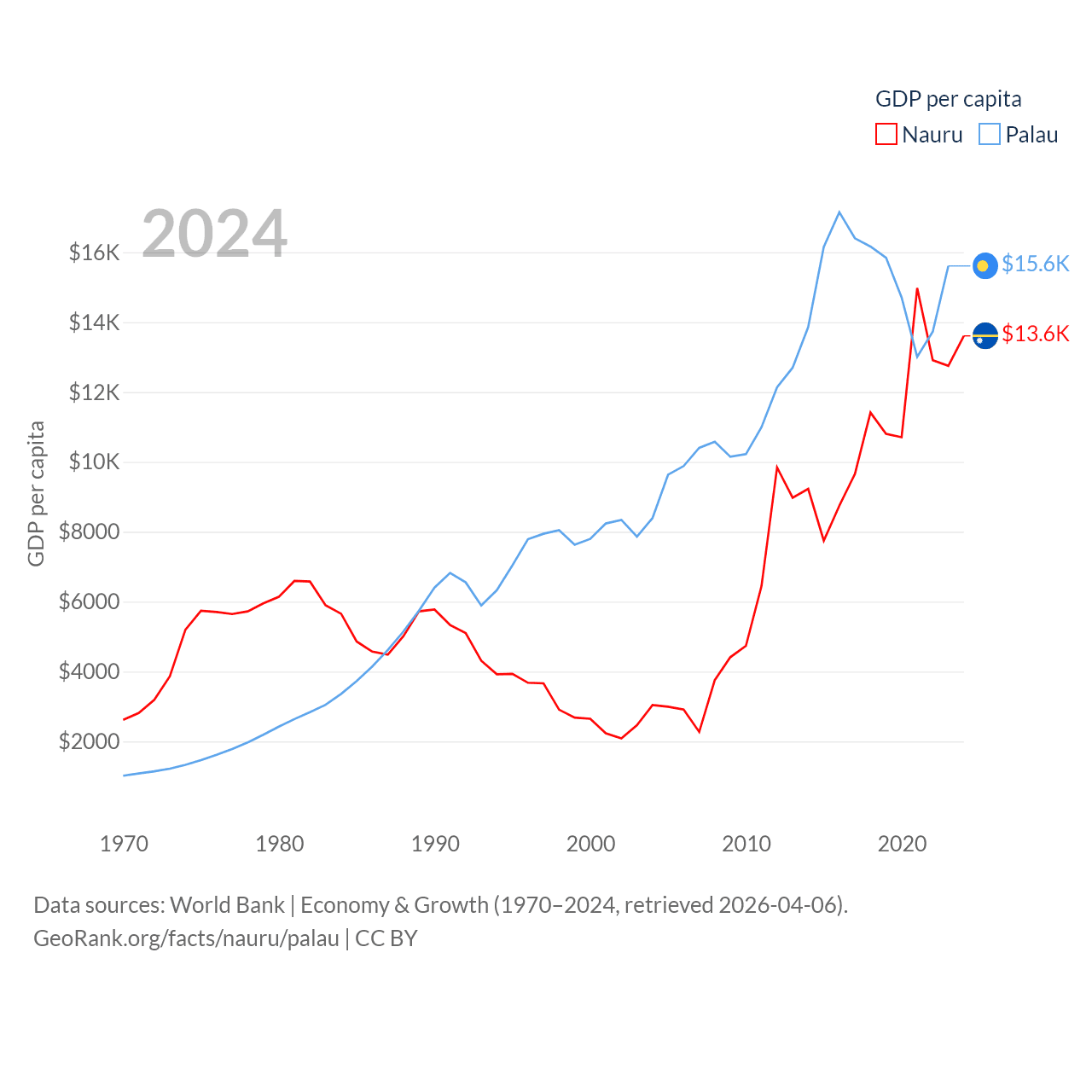 By GDP, Nauru ranks 195/197 ($163M) and Palau ranks 194/197 ($277M). By GDP per capita, Nauru ranks 74/197 ($13,609), while Palau ranks 67/197 ($15,611).