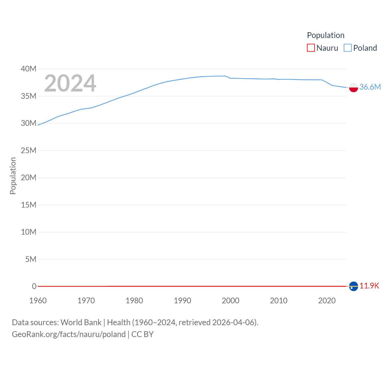 Nauru has a population of 11.9K (ranked 195/197), compared with 36.6M in Poland (ranked 42/197). Nauru's land area is 7.72 sq mi versus 118,252 sq mi for Poland (ranked 195th vs. 69th).