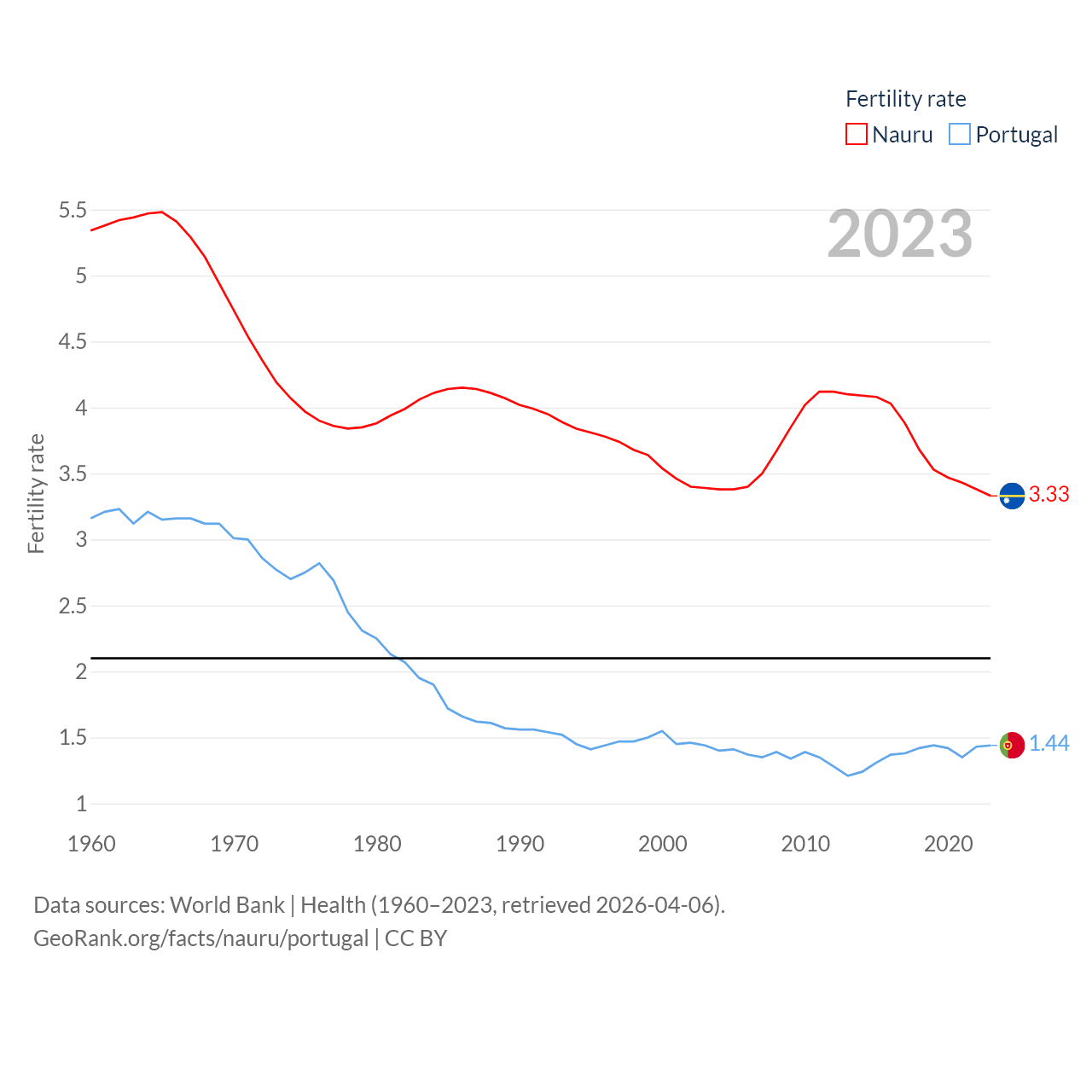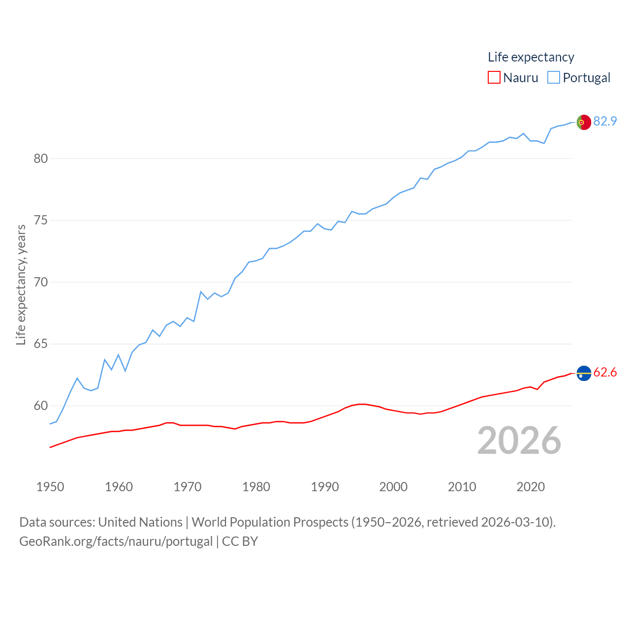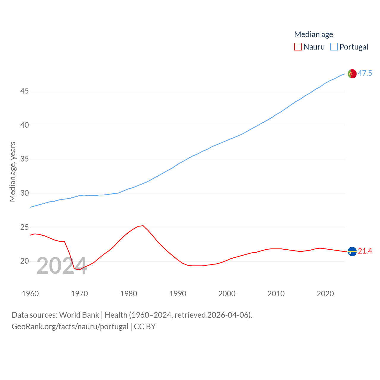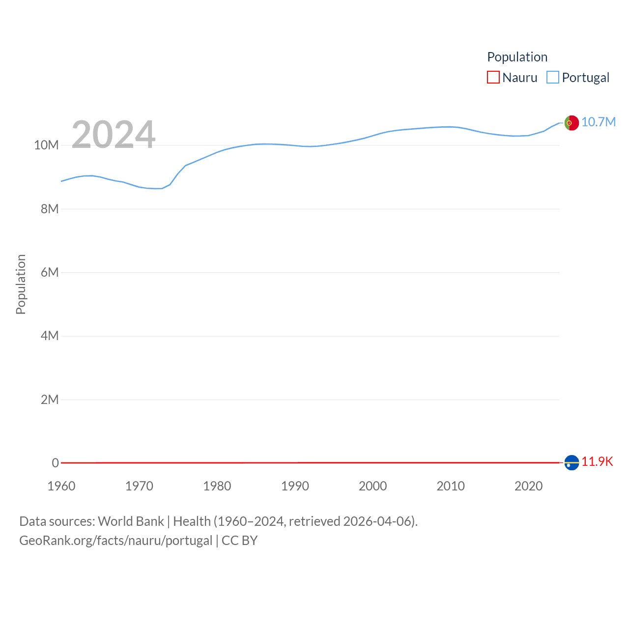 Nauru has a population of 11.9K (ranked 195/197), compared with 10.7M in Portugal (ranked 90/197). Nauru's land area is 7.72 sq mi versus 35,369 sq mi for Portugal (ranked 195th vs. 108th).