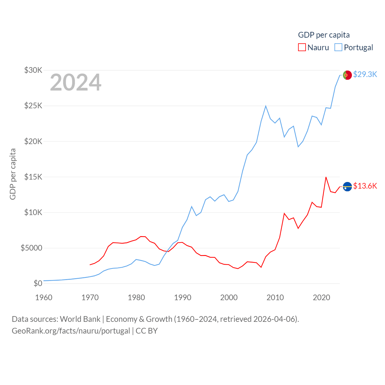 By GDP, Nauru ranks 195/197 ($163M) and Portugal ranks 46/197 ($313B). By GDP per capita, Nauru ranks 74/197 ($13,609), while Portugal ranks 44/197 ($29,292).